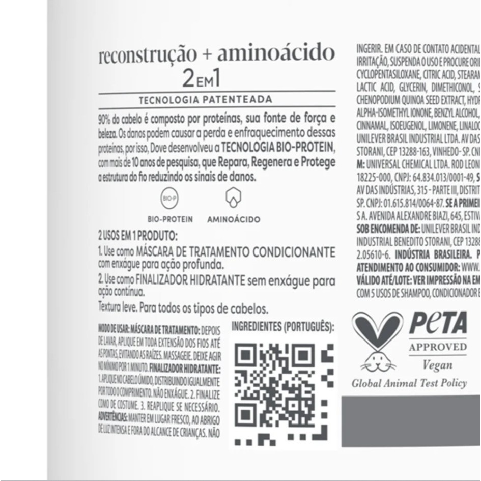 Características do produto: Marca: Dove Modelo: 2 em 1 Hidratação Segmento: Máscara Especificações Técnicas: Tipo: Tratamento Capilar Modelo: Máscara de Tratamento Embalagem do Produto: Pote Composição: Aqua Cetearyl alcohol Cyclopentasiloxane Stearamidopropyl dimethylamine Parfum Dimethiconol Glycerin Lactic acid Sodium benzoate Disodium EDTA Citric acid Sodium gluconate Sodium citrate CI 19149 CL 17200 Argania spinosa kernel oil Helianthus annuus seed oil Lens esculenta seed extract Hydrolyzed cicer seed extract Chenopodium quinoa seed extract Benzyl salicylate Citronellol Coumarin Hexyl cinnamal Modo de Uso: Máscara de tratamento: Após lavar os cabelos, aplique em toda extensão dos fios até as pontas, evitando as raízes. Massageie e deixe agir por no mínimo 1 minuto antes de enxaguar. Finalizador hidratante: Aplique no cabelo úmido, distribuindo igualmente por todo o comprimento. Não enxágue. Finalize como de costume. Reaplique se necessário. Benefícios: Hidratação profunda Nutrição intensa Controle de frizz Maciez Proteção contra pontas duplas Fornecedor: UNILEVER - CABELO