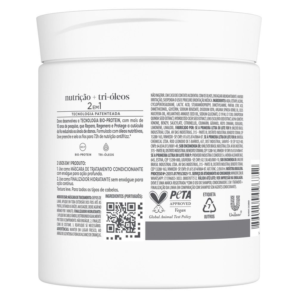Máscara Dove Nutrição + Tri-Óleos 2 em 1 •Dove Máscara Capilar Nutrição + Tri-Óleos, uma máscara capilar nutritiva para cabelo seco que pode ser usada como máscara ou leave-in •Com óleos nutritivos