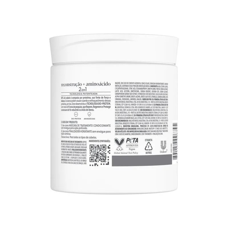 Dove Reconstrução + Aminácido - máscara de tratamento que repara e protege em cada usoDove Máscara Capilar 2 em 1 Reconstrução + Aminoácido é um tratamento capilar de alta versatilidade para cabelos danificados. Produto prático, ideal para o uso contínuo, além de contar com uma fórmula avançada proporciona resultados visíveis desde a primeira aplicação. Com dois modos de uso, atua como máscara de tratamento com enxágue para hidratação profunda e como finalizador hidratante sem enxágue para nutrição prolongada. Desenvolvida com tecnologia patenteada Bio-Protein e aminoácidos, repara até 99% dos danos internos, fortalecendo a estrutura capilar e revitalizando os fios de dentro para fora. Essa máscara capilar intensiva reduz pontas duplas, previne o frizz, sela as cutículas e devolve o brilho e a maciez, sendo ideal para cabelos fragilizados, ressecados ou quimicamente tratados. É um creme hidratante essencial para complementar a etapa de reconstrução do cronograma capilar, oferecendo benefícios de salão no cuidado diário. Formulada com queratina vegana, dermatologicamente testada, essa máscara é um exemplo de cuidado seguro e consciente. Dove, expert em danos, entende que 90% da composição do cabelo é feita de proteínas que, ao serem perdidas, comprometem a força e a beleza dos fios, por isso desenvolveu uma solução completa para reparar, regenerar e proteger cada fio. Para melhores resultados, utilize em conjunto com o shampoo e o condicionador da linha Dove Reconstrução + Aminoácido e descubra cabelos mais fortes, saudáveis e renovados. Dano interno com 5 usos de shampoo, condicionador e máscara da linha. Benefícios : - Máscara Capilar Dove 2 em 1 Reconstrução + Aminoácido com tecnologia patenteada para reconstrução completa dos fios danificados - Tratamento com dois modos de uso: como máscara com enxágue ou finalizador sem enxágue para ação prolongada - Fórmula com aminoácidos e tecnologia Bio-Protein que repara até 99% dos danos internos e fortalece a fibra capilar - Máscara intensiva e hidratante ideal para cronograma capilar, com queratina vegana, dermatologicamente testada - Reduz pontas duplas, sela cutículas, previne o frizz e devolve brilho e maciez aos cabelos ressecados ou quimicamente tratados - Produto prático e versátil com resultados visíveis desde a primeira aplicação As máscaras de tratamento de 1 minuto são tão eficazes quanto as máscaras com ação de 20 minutos? Sim, a máscara de tratamento de 1 minuto pode ser eficaz, especialmente para cuidados rápidos e frequentes. Essas máscaras têm fórmulas concentradas que agem de forma intensa em pouco tempo, sendo práticas para o dia a dia. No entanto, máscaras com ação de 20 minutos geralmente oferecem hidratação e reparação mais profundas, ideais para um tratamento mais intensivo. Ambas são boas, mas a escolha depende das necessidades do seu cabelo e do tempo disponível. Touca plástica, toalha ou cabelo solto: o que usar enquanto a máscara de tratamento age? Enquanto a máscara de tratamento age, usar uma touca plástica ou uma toalha quente pode potencializar os efeitos, pois ajudam a reter o calor e a abrir as cutículas do cabelo, permitindo que o produto penetre melhor nos fios.