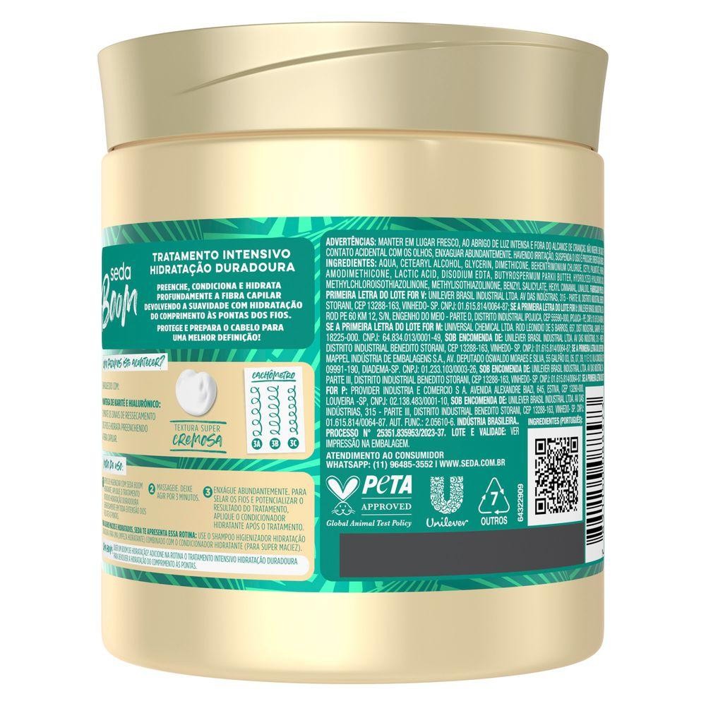•A Máscara de Tratamento Seda Boom Hidratação Duradoura é o novo tratamento intensivo que devolve a suavidade do cabelo e retém a hidratação por mais tempo •A fórmula dessa máscara de tratamento é enriquecida com manteiga de karité e hialurônico, que combate os sinais de ressecamento dos fios e hidrata, preenchendo a fibra capilar •Máscara capilar que preenche e hidrata profundamente os fios, deixando-os suaves do comprimento às pontas •Esta máscara de tratamento intensivo Seda Boom possui uma textura super cremosa que protege e prepara o cabelo para uma melhor definição •Essa máscara de tratamento é ideal para cabelos cacheados ou ondulados e é livre de parabenos e óleo mineral •A Máscara de Tratamento Seda Boom Hidratação Duradoura deixa seu cabelo cacheado profundamente hidratado Seda Boom surpreende-nos com este novo tratamento intensivo para ginga do cacho! A Máscara de Tratamento Seda Boom Hidratação Duradoura devolve a suavidade do cabelo e retém a hidratação por mais tempo. Esta máscara é enriquecida com manteiga de karité e hialurônico, que combate os sinais de ressecamento dos fios e hidrata, preenchendo a fibra capilar. Esta fórmula vai deixar seus fios profundamente hidratados e incrivelmente suaves como eles merecem! Essa máscara capilar é livre de parabenos e óleo mineral em sua composição. Com a Linha Seda Boom você escolhe sua máscara de tratamento de acordo com a finalização que deseja, afinal, sejam os seus cabelos cacheados, crespos ou ondulados, você é livre para se expressar como quiser. Dicas de finalização: 1. Após higienizar com Seda Boom Hidratação, aplique o tratamento intensivo Hidratação Duradoura generosamente em toda extensão dos fios até as pontas. 2. Massageie. Deixe agir por 3 minutos. 3. Enxágue abundantemente. Para selar os fios e potencializar o resultado do tratamento, aplique o Condicionador hidratante após o tratamento. Para cachos macios e hidratados, Seda te apresenta essa rotina: use o Shampoo Higienizador Hidratação Duradoura, para uma limpeza hidratante, combinado com o Condicionador hidratante, para super maciez. Dica Boom: Quer um Boom de hidratação? Adicione na rotina o Tratamento Intensivo Hidratação Duradoura para devolver a hidratação do comprimento às pontas. Seda possui a certificação PETA, o que significa que não testa seus produtos em animais.