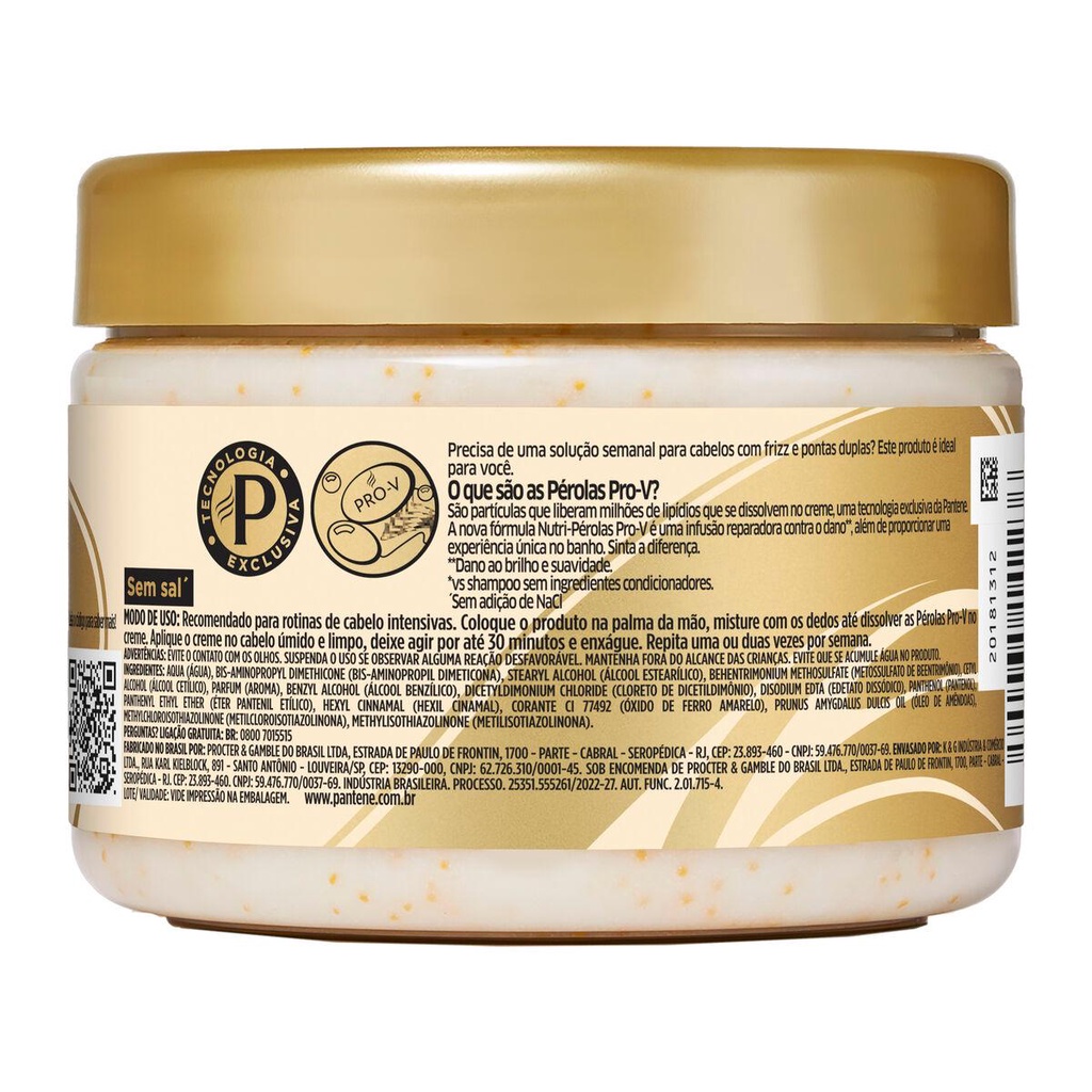 LONG DESCRIPTION:Precisa de uma solução para cabelos com frizz e pontas duplas? A Máscara Capilar Nutrição Pantene é para você! Complete o seu cronograma capilar com a nova máscara de nutrição Pantene. A nova fórmula Nutri-Pérolas Pro-V é uma infusão reparadora contra o dano*; contém Pérolas Pro-Vitaminas solúveis e Óleo de Amêndoas, para fios até 100% mais fortes** e preenchidos. As Pérolas Pro-V são partículas que liberam milhões de lipídios que se dissolvem no creme, uma tecnologia exclusiva Pantene. Sinta a diferença. *Dano ao brilho e a suavidade.**vs shampoo sem ingredientes condicionadores depois de 4 usos. SHORT DESCRIPTION:Precisa de uma solução para cabelos com frizz e pontas duplas? A Máscara Capilar Nutrição Pantene é para você! Complete o seu cronograma capilar com a nova máscara de nutrição Pantene. A nova fórmula Nutri-Pérolas Pro-V é uma infusão reparadora contra o dano*; contém Pérolas Pro-Vitaminas solúveis e Óleo de Amêndoas, para fios até 100% mais fortes** e preenchidos. *Dano ao brilho e a suavidade.**vs shampoo sem ingredientes condicionadores depois de 4 usos. • Contém Pérolas Pro-Vitaminas solúveis e Óleo de Amêndoas • Para fios até 100% mais fortes* e preenchidos • Ideal para cabelos com frizz e pontas duplas • As Pérolas Pro-Vitaminas são partículas que liberam milhões de lipídios que se dissolvem no creme, uma tecnologia exclusiva Pantene • Ideal para o seu cronograma capilar • *vs shampoo sem ingredientes condicionadores