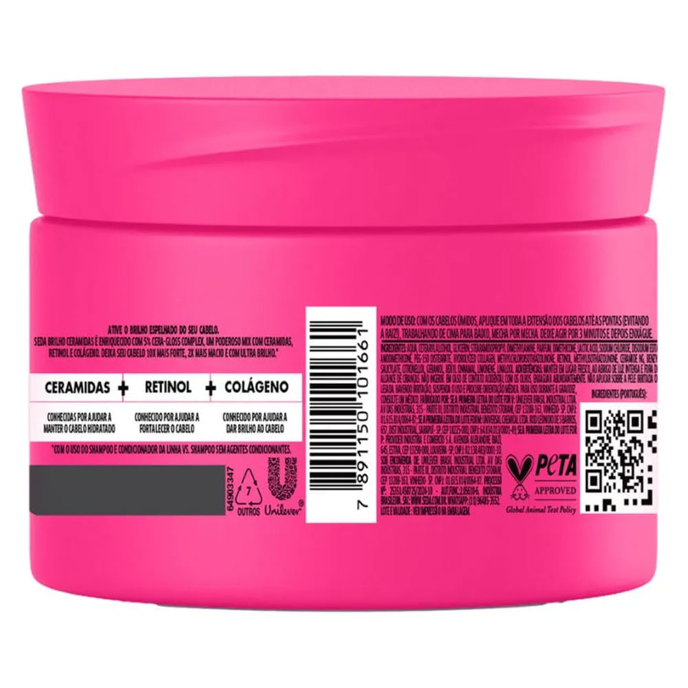 • Máscara de tratamento Seda, fórmula com 5% Cera-Gloss Complex composta por ceramidas, retinol e colágeno. Promove cabelos 10x mais fortes e com ultra brilho*. • Promove uma superfície mais uniforme, que reflete a luz e dá mais brilho*. • Pode ser usado na etapa de hidratação do cronograma capilar. • Com os cabelos úmidos, aplique em toda a extensão dos cabelos até as pontas (evitando a raiz!), trabalhando de cima para baixo, mecha por mecha. Deixe agir por 3 minutos e depois enxágue. • Máscara capilar que oferece hidratação intensa, 48h de hidratação*. Ativo o brilho espelhado do seu cabelo com a máscara de tratamento Seda Brilho Ceramidas. Este produto é enriquecido com 5% CERA-GLOSS COMPLEX, uma poderosa mistura de ceramidas, retinol e colágeno. Um complexo desenvolvido para deixar seu cabelo 10x mais forte e com ultra brilho*. As ceramidas são conhecidas por ajudar a manter o cabelo hidratado, o retinol é conhecido por fortalecer os fios, enquanto o colágeno é conhecido por proporcionar brilho ao cabelo. Modo de Uso: aplique o produto nos cabelos úmidos, distribuindo por toda a extensão dos fios até as pontas, evitando a raiz. Trabalhe de cima para baixo, mecha por mecha, e deixe agir por 3 minutos antes de enxaguar. Seda Brilho Ceramidas promove hidratação intensa e prolongada. Conheça a linha completa e experimente um regime capilar excepcional! Uma família de produtos de cabelo desenvolvidos para atender às necessidades específicas e entregar resultados incríveis. *vs shampoo sem agentes condicionantes