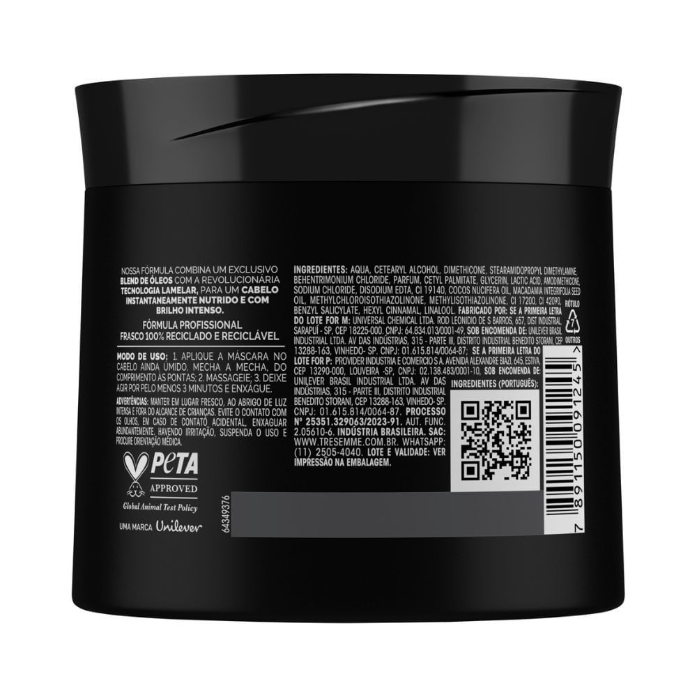 • A Máscara de Tratamento TRESemmé Brilho Lamelar possui tecnologia lamelar, que corrige instantaneamente as irregularidades dos fios, devolvendo uma superfície uniforme, nutrida e com brilho intenso