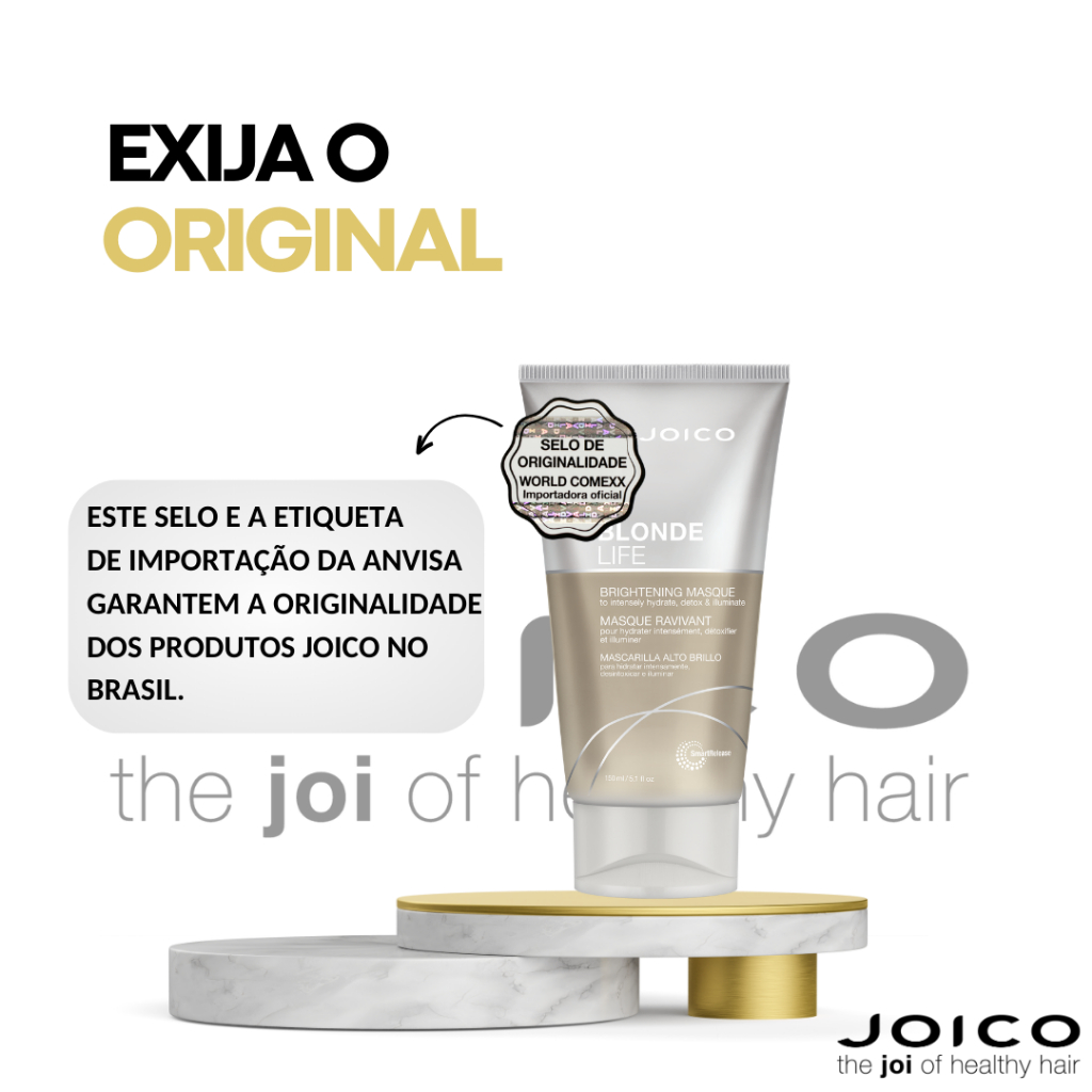 A Joico Blonde Life Brightening Masque é uma máscara capilar de tratamento profundo desenvolvida especialmente para cabelos loiros, descoloridos ou com mechas. Sua ação detox hidratante remove impurezas e resíduos minerais que causam opacidade, ao mesmo tempo em que hidrata, fortalece e devolve o brilho natural aos fios. ESPECIFICAÇÕES TÉCNICAS: Marca: Joico Cor: Levemente perolada Textura: Rica e cremosa Peso líquido: 150ml Origem: Importado (EUA) Indicação: Cabelos loiros naturais, descoloridos, com luzes ou mechas Fórmula: Óleo de monoi, óleo de tamanu, arginina, antioxidantes, SmartRelease™ Ação: Detox dos fios, hidratação intensa, brilho e maciez Frequência de uso: 1 a 2 vezes por semana Tipo de uso: Profissional e home care Produto lacrado e com selo de originalidade Benefício: Remove resíduos e impurezas que apagam o loiro Benefício: Hidrata sem pesar e fortalece contra a quebra Benefício: Deixa os fios soltos, macios e com brilho radiante Garantia: Produto original com garantia de procedência CUIDADOS Uso externo. Evite contato com os olhos. Manter fora do alcance de crianças. Armazenar em local seco, fresco e longe da luz solar.