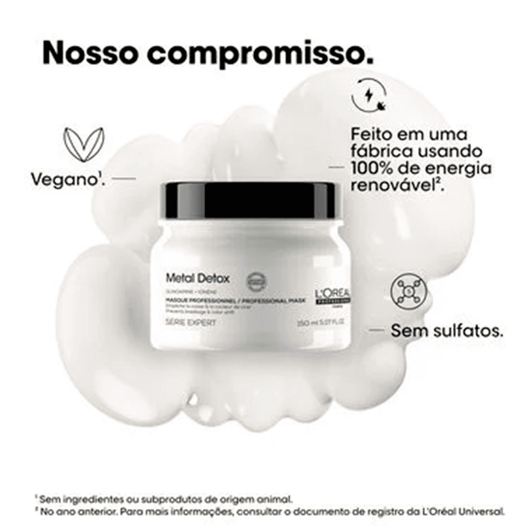 Máscara Metal Detox 150ml - L'Oréal Professionnel A Máscara Metal Detox é um tratamento profissional desenvolvido para neutralizar o acúmulo de metais nos fios, provenientes da água durante as lavagens. Essa inovação científica da L'Oréal Professionnel combate uma das principais causas de quebra capilar e alteração da cor, garantindo cabelos mais resistentes, macios e com cor protegida. Sua fórmula enriquecida com Glicoamina e Ionene trata profundamente a fibra capilar, prevenindo reflexos indesejados e preservando a intensidade da coloração. Benefícios: Neutraliza partículas metálicas acumuladas nos fios. Reduz a quebra e danos causados por metais. Protege e prolonga a durabilidade da cor. Mantém os cabelos fortes, macios e com brilho intenso. Ideal para cabelos coloridos, descoloridos ou com mechas. Modo de Uso:Aplique uma porção da máscara do comprimento às pontas, torça os fios e deixe agir de 2 a 5 minutos. Enxágue abundantemente. Ingredientes:Aqua/Water/Eau, Cetearyl Alcohol, Amodimethicone, Behentrimonium Chloride, Cetyl Esters, Parfum/Fragrance, Isopropyl Alcohol, Trideceth-6, Phenoxyethanol, Limonene, Cetrimonium Chloride, Hexyl Cinnamal, Linalool, Chlorhexidine Dihydrochloride, Citral, Geraniol, Glycine, Tocopherol, Polyquaternium-7, Sodium Benzoate.