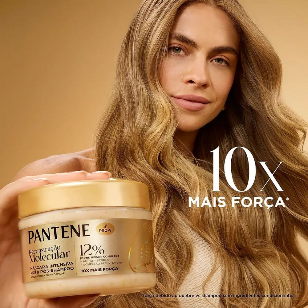 Máscara Intensiva Pré e Pós Shampoo Pantene Recostução Molecular Bond Repair 270ml O que é e para que serve A Máscara Intensiva Pré & Pós-Shampoo Pantene Pro-V Science Molecular Bond Repair é o tratamento profundo ideal para cabelos muito danificados, fracos e quebradiços, oferecendo reconstrução capilar em nível molecular e 10x mais força desde o primeiro uso°. Com Amino-Peptídeo e Complexo Pro-Vitamina, sua fórmula inteligente atua dentro da fibra capilar, reparando as ligações rompidas, restaurando a elasticidade e devolvendo maciez, brilho e resistência. Versátil e poderosa, pode ser usada como pré-shampoo, máscara de tratamento ou condicionador, garantindo resultados visíveis e toque sedoso logo nas primeiras aplicações. Para quem é indicada Ideal para quem possui: Cabelos danificados por químicas, coloração ou uso excessivo de calor; Fios quebradiços, ressecados e sem vida; Cabelos que precisam de reconstrução e hidratação intensiva diária; Quem busca tratamento profissional com resultados imediatos e duradouros. Benefícios Reconstrói a fibra capilar desde o nível molecular; Até 10x mais força e resistência contra a quebra; Hidratação profunda e nutrição intensa; Reforça as ligações capilares danificadas por agressões químicas e térmicas; Sem adição de sal (NaCl), ideal para uso frequente; Deixa os fios mais saudáveis, macios e com brilho natural; Textura leve, não pesa nos fios; Pode ser usada de 3 maneiras diferentes: Pré-Shampoo, Máscara de Tratamento ou Condicionador. Principais ativos e como atuam Amino-Peptídeo: fortalece as estruturas internas do fio, reconectando ligações capilares rompidas e reduzindo a quebra. Complexo Pro-Vitamina: nutre profundamente e restaura a maciez, brilho e vitalidade dos cabelos. Tecnologia Bioativa Pantene Pro-V Science: atua diretamente na reparação molecular, promovendo resultados progressivos e duradouros. Como usar A versatilidade da máscara permite três formas de aplicação, conforme a necessidade dos fios: Como Máscara de Tratamento: Após lavar os cabelos com o Shampoo Pantene Molecular Bond Repair, aplique a máscara nos fios úmidos, do comprimento às pontas. Massageie e deixe agir de 1 a 5 minutos, depois enxágue abundantemente. Como Pré-Shampoo: Antes de lavar os cabelos, aplique o produto do meio às pontas, espalhando e massageando bem. Deixe agir por pelo menos 1 minuto e em seguida lave normalmente com shampoo e condicionador. Como Condicionador: Após o shampoo, aplique a máscara nos fios úmidos, deixe agir por alguns instantes e enxágue. Ideal para uso diário em cabelos muito danificados. Como funciona A tecnologia Pantene Pro-V Science Molecular Bond Repair trabalha na reconstrução das ligações moleculares internas da fibra capilar, restaurando o equilíbrio entre força e elasticidade. O resultado é um cabelo 10x mais forte°, macio, hidratado e livre de frizz, com aspecto saudável e movimento natural. Com o uso contínuo, os fios recuperam a integridade estrutural, tornando-se visivelmente mais resistentes e brilhantes. Precauções Não utilize em caso de alergia a algum componente da fórmula. Evite o uso em couro cabeludo lesionado ou irritado. Evite contato com os olhos; caso ocorra, enxágue com água em abundância. Manter fora do alcance de crianças. Características 270ml Textura cremosa e leve Sem sal (sem adição de NaCl) Dermatologicamente testada Uso diário e versátil (pré, pós ou condicionador)