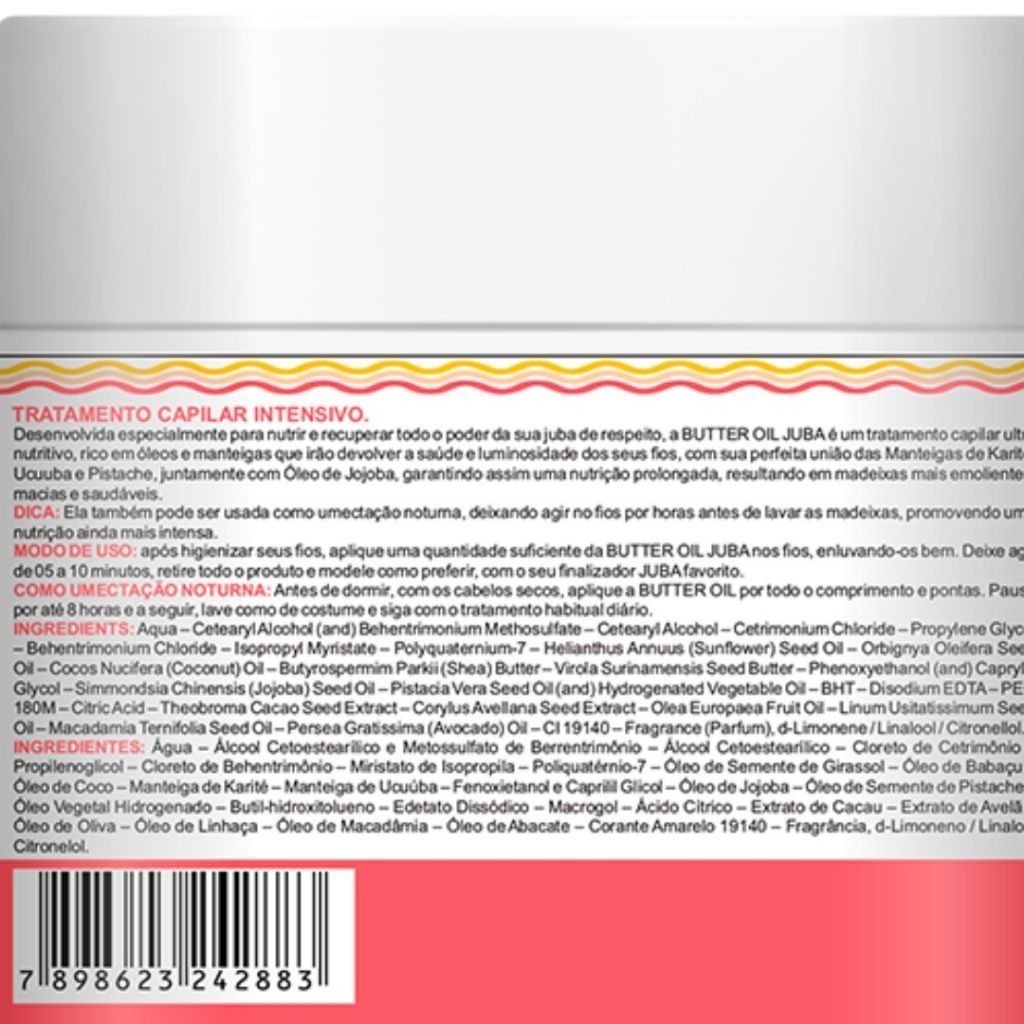 Mascara Juba Butter Oil Manteiga Widi Care - 500g A BUTTER OIL JUBA é um tratamento capilar intensivo condicionante desenvolvido para nutrir e revitalizar os cabelos, especialmente os mais ressecados e danificados. Sua fórmula é rica em óleos e manteigas que proporcionam uma nutrição profunda aos fios, restaurando sua saúde e luminosidade. Os principais ingredientes ativos incluem Manteiga de Karité, Manteiga de Ucuuba, Manteiga de Pistache e Óleo de Jojoba. Como usar: Aplicação convencional: Após lavar seus cabelos, aplique uma quantidade suficiente da BUTTER OIL JUBA nos fios, assegurando-se de distribuir o produto de maneira uniforme. Massageie suavemente e deixe agir por 5 a 10 minutos. Enxágue bem e, em seguida, modele seus cabelos conforme desejado. Você pode continuar sua rotina de cuidados capilares normalmente. Umectação noturna: Para um tratamento ainda mais intensivo, especialmente indicado para cabelos extremamente ressecados, você pode usar a BUTTER OIL JUBA como umectação noturna. Antes de dormir, com os cabelos secos, aplique o produto em todo o comprimento e nas pontas dos fios. Deixe agir por até 8 horas durante o sono e, no dia seguinte, lave seus cabelos como de costume. Essa técnica ajuda a proporcionar uma nutrição profunda e duradoura aos cabelos.