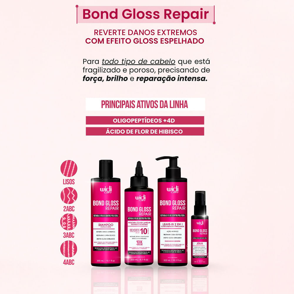 A Máscara Liquída Lamelar Widi Care Bond Gloss Repair 200ml traz uma fórmula inovadora com Oligopeptídeos +4D e Ácido de Flor de Hibisco, que penetra até o córtex, a parte mais profunda do fio, reconstruindo ligações capilares quebradas e restaurando a estrutura interna dos cabelos. Com efeito imediato e textura fluída de rápida absorção, trata as áreas mais danificadas, devolvendo força, elasticidade, densidade e brilho visível desde a primeira aplicação. Benefícios:Reparação inteligente e 10x +brilho espelhado;Alinhamento imediato e efeito gloss;Reverte danos externos em até 10 segundos;Fortalecimento da fibra capilar com leveza;Desembaraço e sedosidade instantâneos;Textura líquida de fácil aplicação e enxágue rápido;Ideal para todos os tipos de cabelo, especialmente os danificados ou opacos.Modo de usar: Após lavar os cabelos com o shampoo, aplique uma pequena quantidade da Máscara Líquida nos cabelos molhados. Enluve e massageie todo o comprimento dos fios por 10 segundos. Ao massagear, você irá perceber um creme se formando e um leve aquecimento do produto. Enxágue. Sobre a marca: Com mais de 10 anos de atuação no mercado da beleza, a marca iniciou sua trajetória atendendo os principais salões do Rio de Janeiro e, posteriormente, expandiu sua presença por todo o Brasil com linhas profissionais. Em 2016, passou a fazer parte da rotina das consumidoras com o lançamento da linha home care, desenvolvida para todos os tipos de fios -cacheados, lisos, alisados ou coloridos. Tudo isso baseado em um princípio essencial: toda beleza importa.