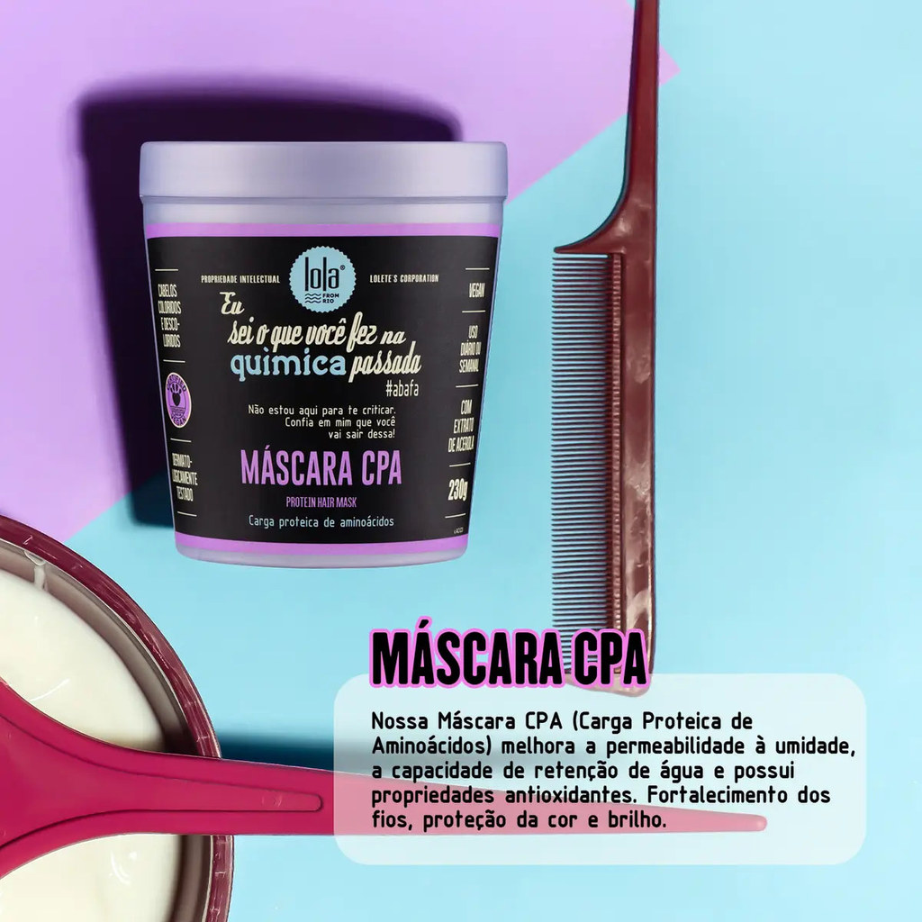 Descrição: A Mascara Lola Cosmetics Eu Sei O Que Voce Fez 230g ajuda cabelos detonados por químicas agressivas como coloração ou descoloração? Isso não te pertence mais! Nossa Máscara CPA (Carga Proteica de Aminoácidos) melhora a permeabilidade à umidade, a capacidade de retenção de água e possui propriedades antioxidantes. Fortalecimento dos fios, proteção da cor e brilho. MODO DE USAR: 1 - Aplique sobre os fios limpos e úmidos, após usar o Shampoo e o Spray CPA. Deixe agir de 3 a 5 minutos e em seguida, enxágue. Finalize como desejar. USO EXTERNO. MANTENHA FORA DO ALCANCE DAS CRIANÇAS. Conteúdo da embalagem: 230g. #Imagem ilustrativa. Cor do produto poderá variar dependendo da configuração do monitor ou celular.