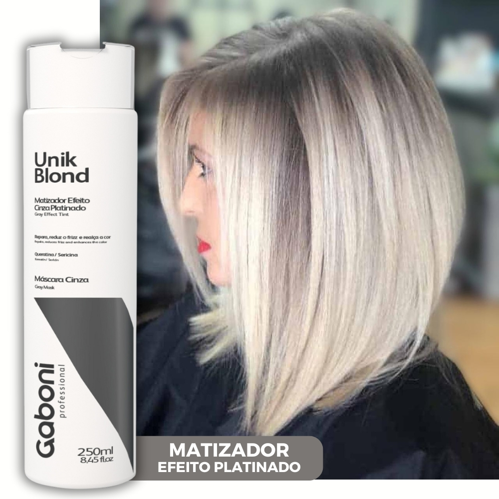 MÁSCARA MATIZADORA EFEITO CINZA PLATINADO UNIK BLOND - 250 ML BENEFÍCIOS: *Neutraliza as tonalidades amareladas/alaranjadas dos cabelos loiros naturais, descoloridos, brancos ou grisalhos; *Não chumba ou resseca os fios; *Promove brilho intenso; *Repara e regenera a fibra capilar; *Protege a integridade dos pigmentos por mais tempo; *Diminue o volume e frizz; *Repara escamas danificadas sem produzir oleosidade. É uma máscara capilar de tratamento cosmético intensivo. Desenvolvida especialmente para promover um incrível efeito acinzentado nos cabelos descoloridos, com mechas, grisalhos e loiros naturais, corrigindo tons indesejados e protegendo a integridade dos pigmentos por muito mais tempo. Sua fórmula possui Queratina e Sericina, que reparam e regeneram a fibra capilar, diminuem o volume e o frizz, conferem efeito liso e reparam escamas danificadas sem produzir oleosidade. MODO DE USO: Após lavar os cabelos, aplique a máscara matizadora começando pelas pontas, evitar o couro cabeludo. Massagear suavemente mecha a mecha e deixar agir por alguns minutos até atingir a cor desejada. Enxágue em seguida e finalize como desejar. TIPO DE CABELO: Cabelos descoloridos, com mechas, brancos, grisalhos e loiros naturais. RENDIMENTO APROXIMADO: + de 15 aplicações.