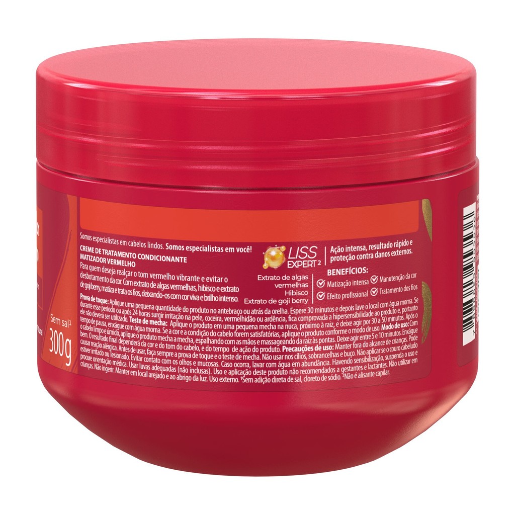 A Máscara Meu Liso Vermelho é ideal para quem possui cabelo avermelhado natural ou colorido e necessita de matização de alta cobertura aos fios e tratamento intenso. Sua fórmula mantém o tom intenso, hidrata e fortalece. INDICAÇÕES Para quais tipos de cabelo? Cabelos lisos naturais, alisados ou relaxados. Cabelos com coloração. Qual a indicação? Cabelos ressecados e cabelos desbotados. Pode usar a partir de quantos anos? A partir de 12 anos. ATIVOS Quais os principais ativos? A Máscara Meu Liso Vermelho Super Vermelho contém algas vermelhas, hibisco e goji berry que garantem a manutenção do tom vermelho intenso, além de hidratar e fortalecer os fios com efeito profissional. MODO DE USO Qual a melhor forma de usar? Com o cabelo limpo e úmido, aplique a Máscara Vermelha mecha por mecha, massageando no sentido da raiz para as pontas. Deixe agir de 5 a 10 minutos. Enxágue bem. Pode ser usado com frequência. O resultado final dependerá da cor e tom do vermelho, além do tempo de ação do produto no cabelo. Prefira usar o produto com luvas plásticas para não manchar as mãos durante a aplicação. CARACTERÍSTICAS É produto vegano? A Máscara Meu Liso Vermelho Super Vermelho é vegana. É liberado? A Máscara Meu Liso Vermelho Super Vermelho não é liberada, mas não contém parabenos.