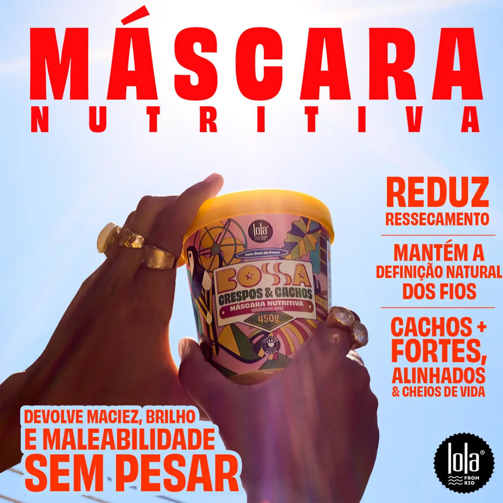 A Máscara Nutritiva Lola Bossa Crespos e Cachos 450g foi especialmente desenvolvida para hidratar profundamente e restaurar a maciez dos fios, devolvendo a vitalidade e o brilho natural aos cabelos crespos e cacheados. Sua fórmula é rica em óleos vegetais e manteigas nutritivas, que repõem os lipídios perdidos, reduzem o frizz e garantem cachos mais definidos, maleáveis e com movimento. Ideal para quem busca fios saudáveis, nutridos e com acabamento de salão. Benefícios:Nutrição intensa e reposição de lipídios.Reduz o frizz e melhora a definição dos cachos.Devolve o brilho e a maciez natural dos fios.Hidrata sem pesar e promove toque sedoso.Fórmula vegana e cruelty free.Modo de usar: Após lavar os cabelos, aplique a máscara mecha a mecha, do comprimento às pontas. Deixe agir por 5 a 10 minutos e enxágue bem. Sobre a marca: A Lola Cosmetics é uma marca brasileira de beleza, criada em 2011 no Rio de Janeiro, com foco em produtos capilares inovadores e com uma comunicação diferenciada. A empresa se destaca por suas fórmulas veganas, cruelty-free e com ingredientes naturais, além de embalagens criativas e nomes chamativos para seus produtos, como "Morte Súbita", "Comigo Ninguém Pode" e "Meu Cacho Minha Vida".