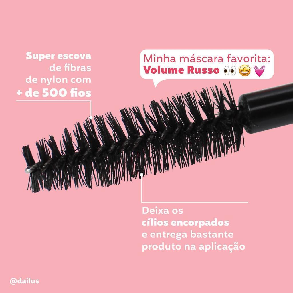DESCRIÇÃO Quer um efeito de cílios postiços já na primeira camada? A máscara para cílios VOLUME RUSSO é a pedida certa para conquistar um volume extremo e que dura o dia todo! O produto deixa os cílios mais encorpados e possui um aplicador exclusivo de fibras de nylon, com 500 fios. Demais, né? Com vitamina E na fórmula, um antioxidante que auxilia na hidratação, nutrição e crescimento dos cílios, a máscara tem secagem rápida e longa duração, sem borrar ou esfarelar após a aplicação. E na hora de remover, não agride os olhos, viu? É super fácil de retirar! Tudo isso sem falar da composição 100% livre de parabenos e oftalmologicamente testada - pode usar sem medo de irritações ou alergias! Por que amamos? - Efeito de cílios postiços - Volume extremo - Fios encorpados - Aplicador exclusivo com 500 fios de fibra de nylon - Infundida em vitamina E - Auxilia na hidratação, nutrição e crescimento dos cílios - Secagem rápida - Longa duração - Não borra - Não esfarela - Fácil remoção - Livre de parabenos - Oftalmologicamente testada - Cruelty-free MODO DE USO Ao tirar a escova do tubo, comece a aplicação depositando o excesso de produto, que vem na pontinha do pincel, nos cílios, segurando o aplicador na posição vertical. Na sequência, faça movimentos de zigue-zague, distribuindo bem o produto da raiz até as pontas dos fios. Assim, você consegue deixar os cílios bem separados e encorpados. Quer ainda mais volume? Repita o processo quantas vezes quiser, criando várias camadas com a máscara. Bora experimentar as nossas dicas? COMPOSIÇÃO WATER (AQUA), SYNTHETIC BEESWAX, PARAFFIN, ACACIA SENEGAL GUM [ACACIA SENEGAL], PALMITIC ACID, TRIETHANOLAMINE, STEARIC ACID, BUTYLENE GLYCOL, COPERNICIA CERIFERA (CARNAUBA) WAX [CERA CARNAUBA] , POLYBUTENE, VP/EICOSENE COPOLYMER, GLYCERYL STEARATE, PHENOXYETHANOL, HYDROXYETHYLCELLULOSE, POTASSIUM SORBATE, ASCORBYL PALMITATE, TOCOPHEROL, SODIUM STEARATE, CI 77499.