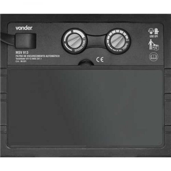Indicada para protecao facial contra raios ultravioleta UV e infravermelhos DIN13, impactos de particulas volantes e respingos de solda. Certificados: 38331 11987 Oferece mais tecnologia, praticidade e seguranca nos trabalhos com solda, sendo uma referencia em inovacao. Dispensa a troca de lentes durante o processo de solda e ajusta-se a capacidade visual de cada operador atraves do botao de ajuste de tonalidade, que varia de 9 a 13. Conta com ajuste de velocidade de escurecimento da lente, fazendo com que permaneca escura por mais tempo ou fique clara rapidamente ao termino da solda. Permite o ajuste de sensibilidade, responsavel pela velocidade que o sensor leva para ativar a protecao da mascara, o que acontece instantaneamente, cerca de 1/2.500 segundos assim que o raio da solda chega ao sensor, protegendo por completo a visao do operador. Alimentacao por bateria de litio/celulas solares. Tonalidade no estado claro: 4. Area de visao: 100 mm x 49 mm. Dimensoes do filtro: 109 mm x 89 mm x 8 mm. Conteudo da Embalagem: 1 Mascara. Detalhes Tecnicos: Modelo:MSV 913 Numero do certificado de aprovacao - CA:38331 Material da mascara para solda:Polipropileno Tipo de visor da mascara para solda:Automatico de cristal liquido Area de visao:100 mm X 49 mm Ajuste de tonalidade da mascara de solda:Tonalidade de 9 a 13 Tonalidade estado claro:DIN 4 Tonalidade das lentes laterais:Nao Possui lente lateral Tempo de ativacao claro-escuro:0,15 s Tempo de ativacao escuro-claro:0,80 s Alimentacao:Bateria de litio/celulas solares Massa aproximada (peso):0.825 kg