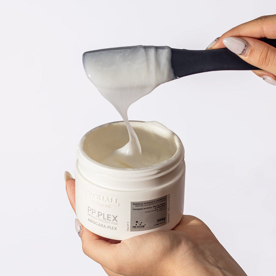 Reparação de Danos e Nutrição Intensa A Máscara Protect Plex 300g e o tratamento ideal para cabelos tingidos e descoloridos que precisam de regeneração e reposição nutritiva. Enriquecida com Complexo Amínico, Vitamina E e Óleo de Palma, sua fórmula foi especialmente desenvolvida para revitalizar a fibra capilar, restaurar a elasticidade e reparar os danos causados por químicas, como tintura, água oxigenada e pó descolorante. Ação Rejuvenescedora e Antioxidante Com propriedades umectantes e antioxidantes, a Máscara Protect Plex repõe os nutrientes perdidos pelos fios e protege contra o ressecamento e os radicais livres. Sua tecnologia exclusiva tambem auxilia na preservação do manto hidrolipídico, garantindo um condicionamento duradouro e fios mais brilhantes e sedosos. Ativos Principais Complexo Amínico Protege os cabelos contra as agressões químicas. Evita o emborrachamento e promove força, brilho e leveza. Vitamina E Possui ação antioxidante, condicionando e suavizando os fios. Previne o enfraquecimento capilar e estimula o rejuvenescimento. Óleo de Palma Rico em nutrientes naturais, hidrata profundamente e reequilibra a elasticidade capilar. Combate o envelhecimento precoce dos cabelos. Benefícios da Máscara Protect Plex Alem da reparação dos fios danificados por processos químicos, a máscara oferece um tratamento completo de hidratação e revitalização. Confira os principais benefícios: Reparação das áreas danificadas por químicas. Hidratação profunda e reposição de nutrientes. Brilho intenso e toque sedoso. Controle do frizz e alinhamento das cutículas. Redução do emborrachamento e fortalecimento da estrutura capilar. Condicionamento duradouro e regeneração da fibra capilar. Indicações de Uso A Máscara Protect Plex e indicada para todos os tipos de cabelo, especialmente fios tingidos, descoloridos e quimicamente tratados que apresentam sinais de ressecamento e fragilidade. Especificações Produto de uso profissional. Tratamento nutritivo e reparador para cabelos quimicamente tratados. Embalagem de 300g, com rendimento aproximado de ate 3 meses para cabelos medios e longos. Precauções Uso externo. Mantenha fora do alcance de crianças. Armazene em local fresco e protegido da luz direta. Em caso de irritação, suspenda o uso e consulte um especialista. Evite contato com os olhos; caso ocorra, enxágue com água abundante.