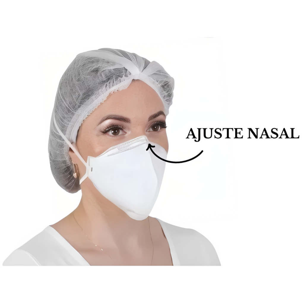 Composição: Confeccionado em quatro camadas, sendo: camada externa de fibra sintética de polipropileno; camada meio de fibras sintética estrutural; camada filtrante de fibra sintética com tratamento eletrostático, camada interna de fibra sintética de contato facial. Com tirantes de cabeça de elástico para sustentação da peça facial e tira metálica para ajuste sobre o septo nasal. Cor: Branco. DESEMPENHO: Este respirador enquadra-se na categoria D.1 b) peça semifacial filtrante (PFF2) para proteção das vias respiratórias contra poeiras, névoas e fumos. Respirador conforme norma NBR 13698 para Peça Semifacial Filtrante.