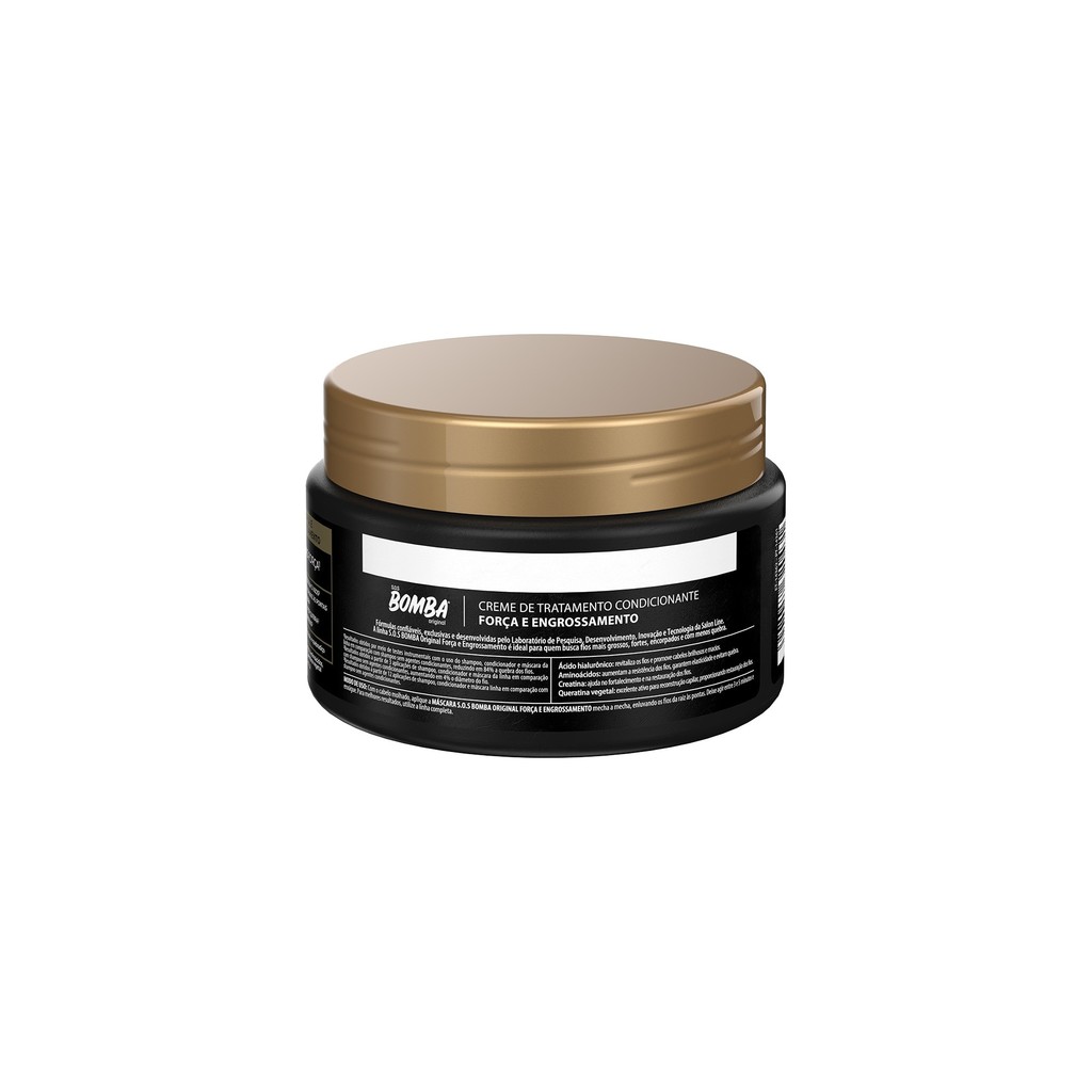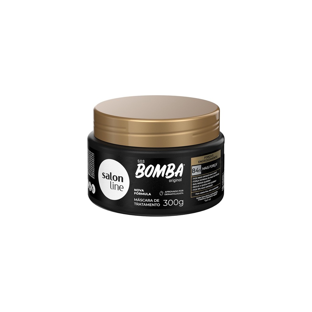 A Máscara Hidratante S.O.S Bomba Força e Engrossamento é ideal para quem busca fios mais grossos, cabelos encorpados, fortes, resistentes e com menos quebra. Possui eficiência comprovada com testes feitos em laboratório independente que garantem os resultados: 89% menos quebra dos fios, fios mais grossos a partir da terceira aplicação e redução de queda por quebra. O produto é dermatologicamente testado. <>INDICAÇÕES$& Para quais tipos de cabelo? Todos os tipos de cabelo. Qual a indicação? Para cabelos finos, ralos e quebradiços. Pode usar a partir de quantos anos? A partir de 12 anos. <>ATIVOS$& Quais os principais ativos? Ácido hialurônico: revitaliza os fios e promove cabelos brilhosos e macios. Aminoácidos: aumentam a resistência dos fios, garantem elasticidade e evitam quebra. Creatina: ajuda no fortalecimento e na restauração dos fios. Queratina vegetal: excelente ativo para reconstrução capilar, proporcionando restauração dos fios. <>MODO DE USO$& Qual a melhor forma de usar? Com o cabelo molhado, aplique a Máscara S.O.S Bomba Força E Engrossamento mecha a mecha, enluvando os fios da raiz às pontas. Deixe agir entre 3 e 5 minutos e enxágue. Para melhores resultados, sempre que lavar os cabelos, use todos os produtos da linha S.O.S Bomba Força e Engrossamento. <>CARACTERÍSTICAS$& É produto vegano? O Shampoo S.O.S Bomba Original Força e Engrossamento é vegano. É liberado? O Shampoo S.O.S Bomba Original Força e Engrossamento não é liberado.