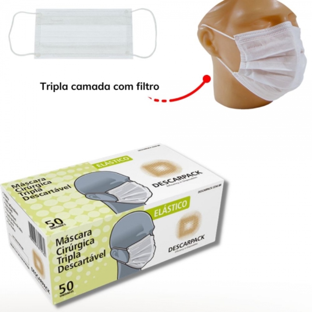 Máscara Tripla Descarpack 3 Camadas Branca e Clipe Nasal Caixa Com 50 Unidades