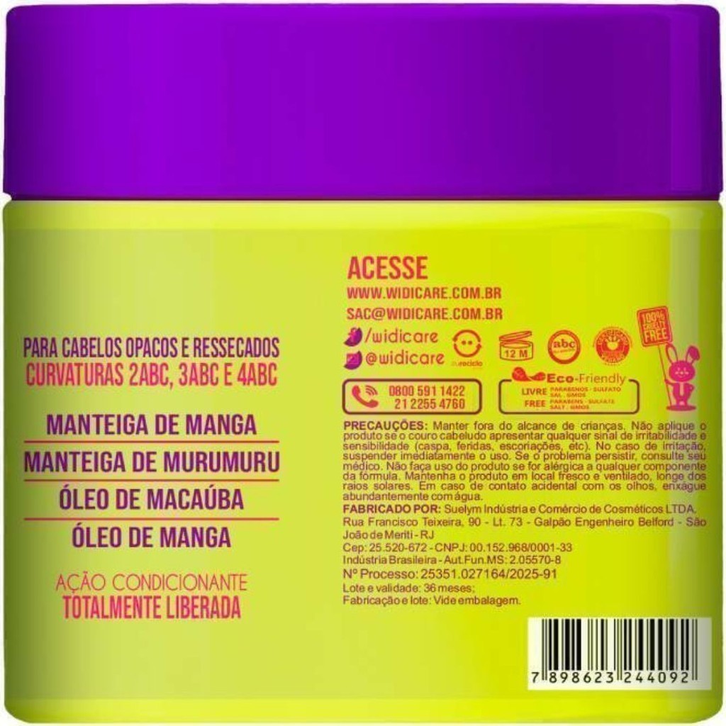 Máscara Widi Care Phytomanga Butter Oil UltraNutritiva 500g A BUTTER OIL ULTRA NUTRITIVA PHYTOMANGA é o tratamento intensivo que seus cabelos sempre pediram! Especialmente desenvolvida para nutrir profundamente os fios e combater o ressecamento, sua fórmula poderosa é rica em manteigas e óleos, que agem de dentro para fora, devolvendo vida, brilho e maciez aos fios opacos e ressecados. Enriquecida com as manteigas de Manga e Murumuru, além dos óleos de Manga e Macaúba, sua fórmula promove nutrição intensa e recupera a saúde dos fios, deixando,os radiantes, macios e cheios de vida. ATIVOS: Manteiga de manga Manteiga de murumuru Óleo de macaúba Óleo de manga