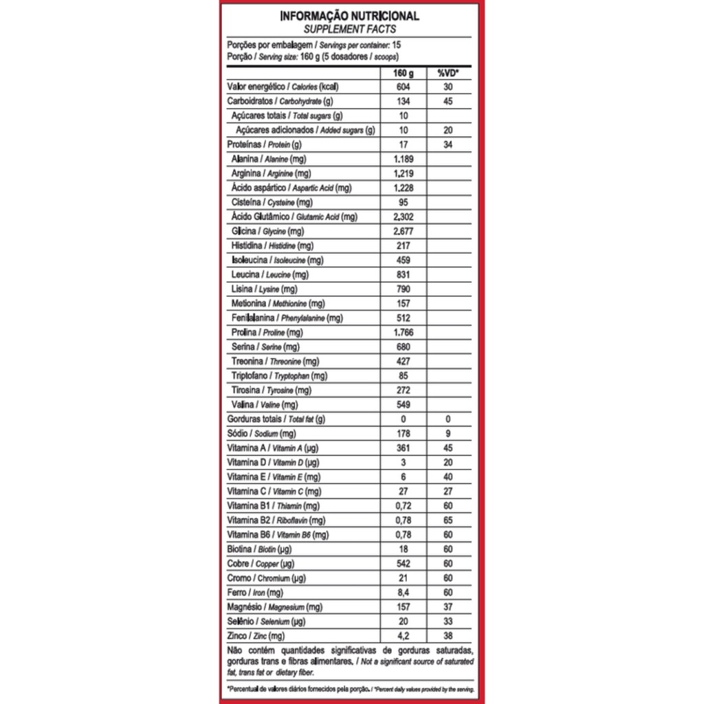 Sobre o Produto: Mass Titanium 17500 Zero Lactose é um suplemento hipercalórico completo, ideal para quem busca ganho de massa muscular, sem a presença de lactose. Ele combina três fontes proteicas de alta biodisponibilidade e digestibilidade com duas fontes de carboidratos. Além disso, sua fórmula é enriquecida com vitaminas e minerais essenciais, que auxiliam na metabolização dos macronutrientes. Destaques: Zero Lactose 17g de proteína por porção 1.849 mg de BCAA por porção Com WPI (Proteína Isolada do Soro do Leite) Ingredientes: Morango: Maltodextrina, waxy maize (amido de milho ceroso), colágeno hidrolisado, proteína isolada da soja, proteína isolada do soro do leite (WPI), mix de vitaminas e minerais, aromatizantes, emulsificante lecitina de arroz*, edulcorante sucralose e corantes artificiais (amaranto e azul brilhante FCF). Benefícios: - Fonte de vitaminas e minerais que ajudam no metabolismo energético. - Auxilia no ganho de massa muscular com suas proteínas de alta qualidade. - Sem lactose, ideal para quem tem intolerância. Modo de Preparo: Misture 160g (5 dosadores) em 250mL de água gelada ou leite desnatado (para dietas sem lactose). Consumir uma porção ao dia, ou conforme orientação profissional. Advertências: - Este produto não é um medicamento. - Não exceder a recomendação diária de consumo. - Mantenha fora do alcance de crianças. Alergênicos: - Contém derivados de leite e soja. - Pode conter derivados de ovo. - Lactose: Não contém.