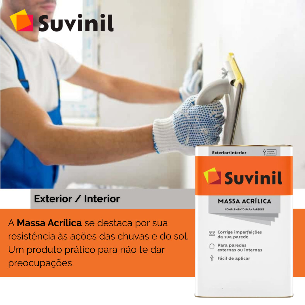 Massa Acrílica Branca 25kg / Suvinil ..................................................................................................................................... INFORMAÇÕES SOBRE O PRODUTO ..................................................................................................................................... Massa Acrílica da Suvinil é a resposta de como deixar a parede lisa. Aplicável em ambientes internos e externos, a massa acrílica se destaca por sua resistência às ações das chuvas e do sol. Um produto prático para não te dar preocupações. Ela preenche poros e resolve desníveis e imperfeições rasas, o que deixa a superfície pronta para ser pintada. ..................................................................................................................................... ESPECIFICAÇÕES DO PRODUTO ..................................................................................................................................... Informações Técnicas: Demãos: 2 a 3 demãos Acabamento: Não informado Secagem: Ao toque: 1 hora Entre demãos: 3 horas Final: 4 horas Marca: Suvinil Dimensões: 25 Kg: 23.5cm x 34.8cm x 23.5cm Peso: 25 Kg: 25.3764kg Diluição: Pronta para uso. Se necessário, adicione até 1,5L de água por lata com 28 Kg e homogeneize bem. Aplicar em camadas finas até obter o nivelamento desejado. Para aplicação com airless dilua com até 10% de água potável e aplique com pressão entre 1800 e 2200 psi. Use bico com abertura de 0,025” e a velocidade de aplicação entre 5 e 9 m2/min. Rendimento: Branco e cores 25 Kg - 80m² acabados. Rendimento obtido pelo método ABNT NBR 14942. Variações devido à superfície e/ou aplicação podem ocorrer. Consulte o boletim técnico para mais informações ..................................................................................................................................... DÚVIDAS FREQUENTES ..................................................................................................................................... Pergunta: Como é embalado o produto? Resposta: Todos os nossos produtos vendidos são embalados em caixas lacradas ou plástico stretch. Em respeito ao meio ambiente 90% das caixas são reutilizadas. Pergunta: Quem faz a entrega? Resposta: A entrega é terceirizada, feita via CORREIOS ou TRANSPORTADORA. Pergunta: O envio é feito em quantos dias? Resposta: Nós enviamos o seu pedido no prazo máximo de 24 horas após a confirmação de sua compra, sendo um dos envios mais rápidos da plataforma. Pergunta: Os produtos são novos ou usados? Resposta: Todos os produtos que trabalhamos são novos e com qualidade garantida. .....................................................................................................................................