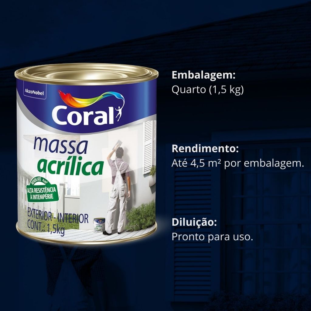 Massa Acrílica Coral 1,5kg, Para Paredes Internas e Externas, Áreas Úmidas, Acabamento Liso e Fino
