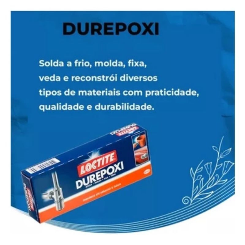 CARACTERÍSTICAS TÉCNICAS: Caixa contendo 12 Unidades de 50g Modelo: Massa Epóxi Aplicações: Metal, Vidro, Madeira, Cerâmica, Cimento, Mármore e Plástico O epóxi mais vendido no Brasil ! Loctite Durepoxi é um produto epóxi bi componente fácil de usar, extra forte e resistente. Solda a frio, molda, fixa, veda e reconstrói diversos tipos de materiais com praticidade, qualidade e durabilidade. Após aplicação, permite acabamento final com tinta e/ou verniz, serra ou lixa. Endurece até de baixo d'água. Durepoxi Branco é o epóxi mais branco do mercado, o que reduz a necessidade de pintura para aplicações mais limpas e bonitas. Recomendado para: Metal, vidro, cerâmica, cimento, mármore e plástico*. *Não adere a materiais à base de polietileno, polipropileno, silicone e PTFE (Politetrafluoretileno - resina antiaderente) Solda, molda, veda e fixa com praticidade, rapidez e segurança Epóxi mais branco do mercado Extra forte e resistente Endurece até debaixo d'água Durepoxi é uma massa epóxi bi componente ideal para o uso profissional, doméstico e artesanato. Durepoxi solda, molda, fixa, veda e reconstrói com praticidade, qualidade e durabilidade. Pode ser utilizado em diversos materiais como metal, madeira, vidro, cerâmica, cimento, mármore e plásticos.OBS.: Não adere a materiais à base de polietileno, polipropileno, silicone e PTFE (Politetrafluoretileno - resina aderente).