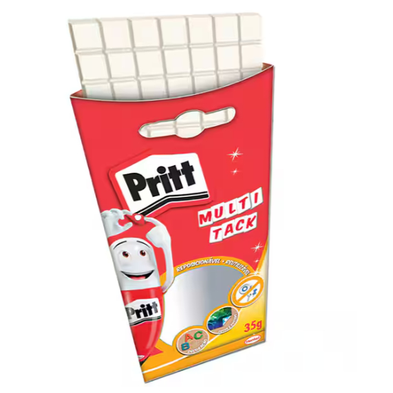 Massa adesiva para a fixao de papis, Pritt. Ideal para a fixao de objetos leves e papis, a massa adesiva da Pitt pode ser utilizada para fixar cartazes, mapas, fotografias, planilhas impressas, recados, vidros, telefones e relgios. Sem sujar nem danificar as superfcies, a massa adesiva Multi Tak reutilizvel por diversas vezes, alm de ser segura por contm frmula no txica.Pritt Multi Tack uma massinha verstil, facilmente removvel e reutilizvel.uma alternativa ideal para tachinhas e fitas adesivas, pois no so permanentes e garantem a remoo fcil de posters, papis, cartazes ou at objetos leves de 250g (por quadrado de adesivo) colados na parede, portas e janelas.Pritt Multi Tak est disponvel em cartelas com 35g.