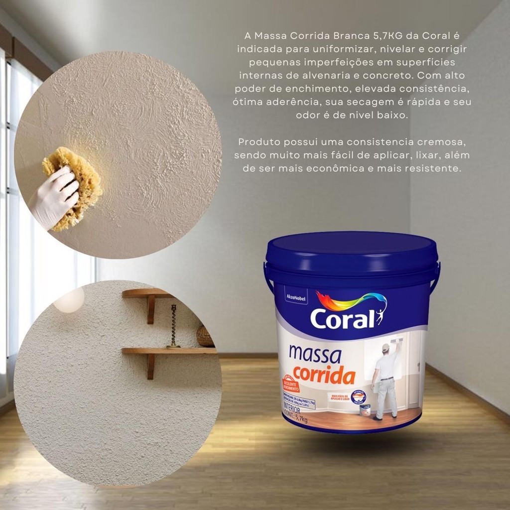 CORAL - Massa corrida 5,7 kg Descrição do Produto Para proteger e manter sua pintura bonita e nova por muito mais tempo é necessário fazer uma boa preparação da superfície. A Massa Corrida Coral é indicada para uniformizar, nivelar e corrigir pequenas imperfeições em superfícies internas de alvenaria e concreto. Com alto poder de enchimento, elevada consistência, ótima aderência, sua secagem é rápida e seu odor é baixo. De consistência cremosa, também é mais fácil de aplicar, econômica e mais resistente. Sua fórmula proporciona também proporciona uma maior facilidade para lixar. ..................................................................................................................................... MATERIAIS DE APLICAÇÃO -Rolo de lã de pelo baixo, pistola, pincel ou trincha ..................................................................................................................................... -Rendimento 3 m²/Kg -Secagem ao toque -Ao toque: 30min -Entre demãos: 3h -Final: 5h -Número de demãos 2 ..................................................................................................................................... CARACTERÍSTICAS DO PRODUTO -Alto poder de enchimento -Alta resistência e poder de preenchimento .................................................................................................................................. LOJA .................................................................................................................................. O grupo SOLUWAN atua neste mercado há mais de 30 anos, possuindo loja física e on-line. Com 30 anos de história procuramos atender nossos clientes com agilidade, competência, ética e honestidade. Vendemos somente produtos novos e de qualidade garantida. Despachamos em até 24 horas. Entregamos para todo o Brasil. .................................................................................................................................. DÚVIDAS FREQUENTES .................................................................................................................................. Pergunta: Como é embalado o produto? Resposta: Todos os nossos produtos vendidos são embalados em caixas lacradas ou plástico stretch. Em respeito ao meio ambiente 90% das caixas são reutilizadas. Pergunta: Quem faz a entrega? Resposta: A entrega é terceirizada, feita via CORREIOS ou TRANSPORTADORA. Pergunta: O envio é feito em quantos dias? Resposta: Nós enviamos o seu pedido no prazo máximo de 24 horas após a confirmação de sua compra, sendo um dos envios mais rápidos da plataforma. Pergunta: Os produtos são novos ou usados? Resposta: Todos os produtos que trabalhamos são novos e com qualidade garantida. ..................................................................................................................................... #massacorrida #massacorridacoral #massa corrida acrilica #massaAcrilica #massa corridadiretodafabrica barrica 25kg #massacorrida18litros #massacorrida25kg #massaacrilica25kg #massa corridaif #massacorridacoral18 l#massacorridasuvinil18 litros #massacorridaalessi #barricademassaparatextura #massacorridapva #massacorridasuvinil