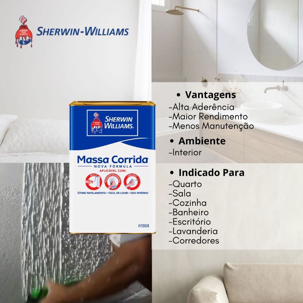 Massa Corrida Metalatex Sherwin Williams 25kg Lata ..................................................................................................................................... INFORMAÇÕES SOBRE O PRODUTO ..................................................................................................................................... SHERWIN-WILLIAMS MASSA CORRIDA é utilizada para nivelar e corrigir pequenas imperfeições em paredes internas secas e tetos. Sua fórmula inovadora permite fácil aplicação através de diversas ferramentas como: Rolo, Airless e a clássica desempenadeira e melhora no lixamento. SHERWIN-WILLIAMS MASSA CORRIDA garante qualidade e economia para sua pintura. ..................................................................................................................................... ESPECIFICAÇÕES DO PRODUTO ..................................................................................................................................... Ambiente:Interior Acabamento: Fosco Diluição Embalagens:Cores Prontas: 1.5, 6 e 25 kg Secagem:Ao Toque: 1 hora Entre Demãos: 2 - 4 horas Final: 4 horas Aplicação:Desempenadeira,Espátula,Rolo eAirless Demãos: 2 a 3 ..................................................................................................................................... DÚVIDAS FREQUENTES ..................................................................................................................................... Pergunta: Como é embalado o produto? Resposta: Todos os nossos produtos vendidos são embalados em caixas lacradas ou plástico stretch. Em respeito ao meio ambiente 90% das caixas são reutilizadas. Pergunta: Quem faz a entrega? Resposta: A entrega é terceirizada, feita via CORREIOS ou TRANSPORTADORA. Pergunta: O envio é feito em quantos dias? Resposta: Nós enviamos o seu pedido no prazo máximo de 24 horas após a confirmação de sua compra, sendo um dos envios mais rápidos da plataforma. Pergunta: Os produtos são novos ou usados? Resposta: Todos os produtos que trabalhamos são novos e com qualidade garantida. .....................................................................................................................................