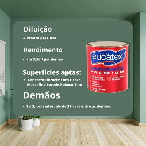 Eucatex Massa Corrida Premium ======================================================================= Eucatex Massa Corrida Premium é um produto de primeira linha, indicado para nivelar e corrigir imperfeições rasas de superfícies internas de reboco, gesso, massa fina, fibrocimento, concreto, blocos de concreto e paredes pintadas com látex PVA ou acrílico, proporcionando um acabamento liso e sofisticado. É um produto de fácil aplicação, secagem rápida e excelente poder de enchimento. ======================================================================= ESPECIFICAÇÕES TÉCNICAS: ======================================================================= SUPERFÍCIE: Uso interno. -Reboco -Gesso -Massa fina -Fibrocimento -Concreto -Blocos de concreto -Paredes pintadas com látex PVA ou acrílico DILUIÇÃO: Pronto para uso RENDIMENTO: Galão 1,45kg (900ml): até 3,5m² por demão EMBALAGEM: Galão 1,45kg (900ml) DEMÃOS: 2 a 3, com intervalo de 2 horas entre as demãos SECAGEM: -Ao toque: 1 hora -Final: 4 horas APLICAÇÃO: -Desempenadeira -Espátula de aço ======================================================================= LOJA ======================================================================= - O grupo Soluwan possui loja física e online a mais de 29 anos satisfazendo nossos clientes. - Vendemos somente produtos novos e de qualidade garantida. - Despachamos em 24 horas - Entregamos para todo o BRASIL. #massa corrida suvinil #massa corrida #massa corrida coral #massa corrida acrilica #tinta leinertex #massa plastica #massa corrida 25kg #massa corrida acrilica 25kg #massa corrida 25 kg #massa corrida pva 25kg #massa corrida 18 litros #massa corrida pva eucatex #repara paredes #elastiment #massa corrida nova 25kg #massa corrida pva 5 4kg branco iquine
