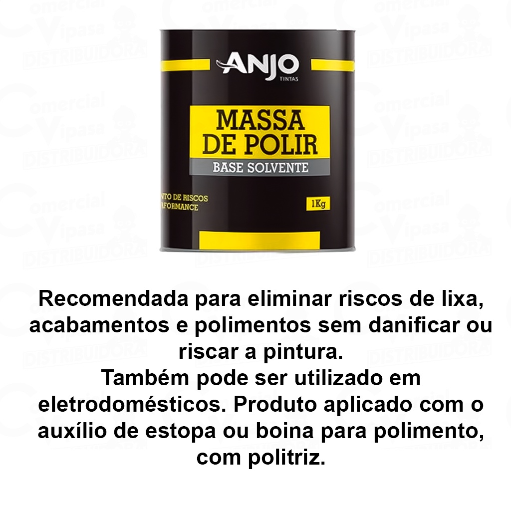 COMERCIAL VIPASA DISTRIBUIDORA. ESCOLHER TAMANHOS E MARCA DESEJADA NAS VARIAÇÕES.. MASSA DE POLIR ANJO E MAXI RUBBER ANJO 500G MAXI RUBBER 970G Massa Para Polir Nº2 Recomendada para eliminar riscos de lixa, acabamentos e polimentos sem danificar ou riscar a pintura. Também pode ser utilizado em eletrodomésticos. Produto aplicado com o auxílio de estopa ou boina para polimento, com politriz. Cor branca. A Massa de Polir Maxi Rubber Nº2 é um produto com ótimo poder abrasivo, consistência leve e isenta de silicones. É indicada para polimentos de superfícies pintadas com produtos do tipo lascas, esmaltes de secagem ao ar e em estufa, epoxy, poliéster e verniz bicomponente, acrílicos e poliuretanos, deixando uma superfície lisa, brilhante e protegida de atmosferas urbanas e industriais. Ideal também para ser aplicada diretamente sobre pinturas desgastadas e manchadas dos veículos em geral, motos, barcos e eletrodomésticos esmaltados. Instruções de Uso Para garantir uma aplicação segura e com máxima performance, siga as instruções abaixo. -A Massa de Polir Maxi Rubber Nº2, deve ser aplicada sobre superfícies limpas, isentas de poeira e oleosidade. -Com movimentos uniformes e circulares, aplicar a massa com algodão ou papel para polimento, até a distribuição total da massa. -Dar brilho com papel para polimento ou com uma politriz com boina de lã (carneira). Recomendações: Após o uso, aplicar Cera Profissional Automotiva. Indicada para o polimento de todo o tipo de acabamento automotivo original e/ou repintura que tenham um alto grau de calcinação, restaurando o aspecto original da pintura, realçando a cor e o brilho. Pode também ser utilizado em metais cromados, motos, barcos e eletrodomésticos esmaltados para limpeza e realce do brilho sem deixar riscos. Massa de consistência leve, isenta de silicones, com maior poder abrasivo, de fácil aplicação, que proporciona um acabamento perfeito. COMERCIAL VIPASA DISTRIBUIDORA.