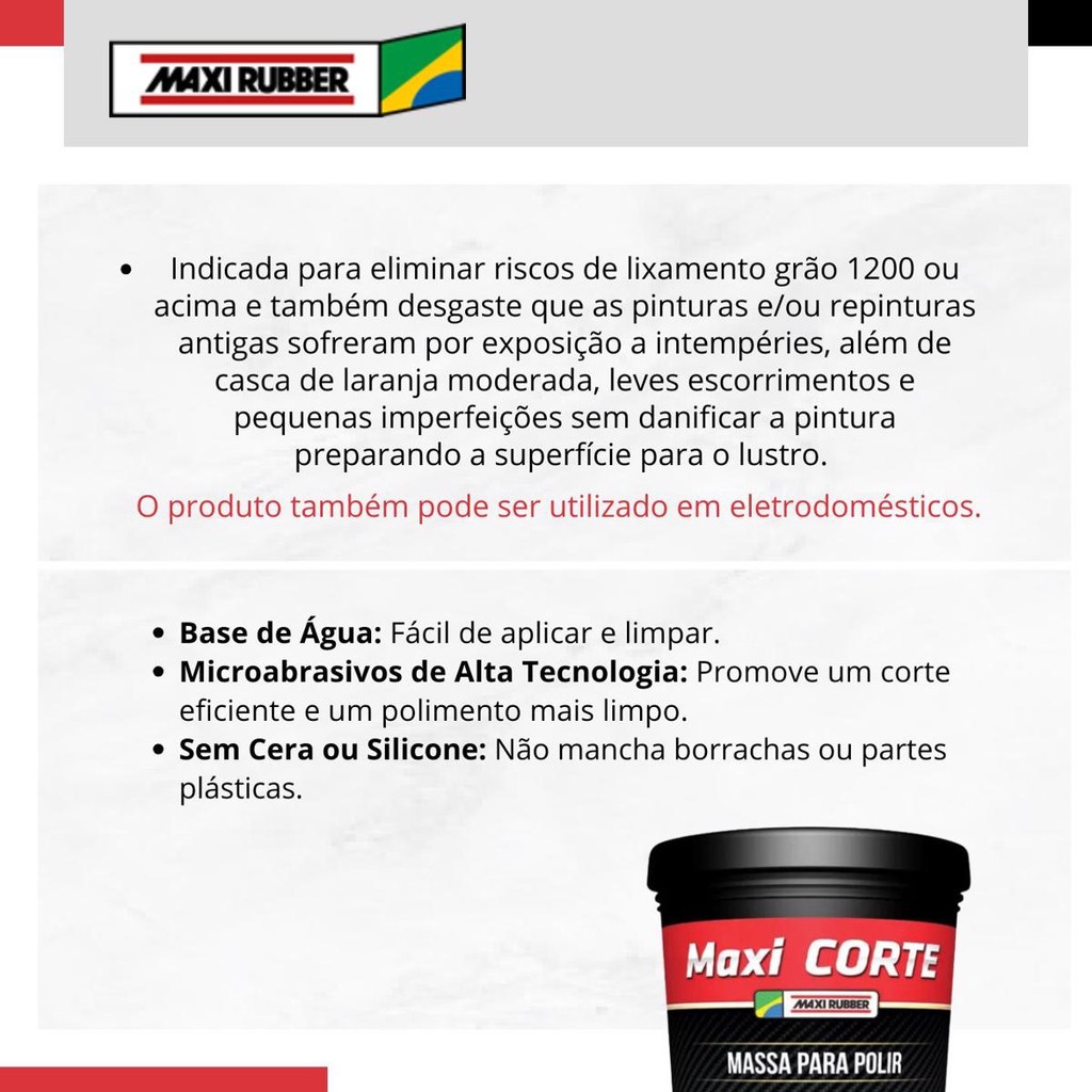 Massa de Polir Maxi Corte 500g Maxi Rubber A massa de polir Maxi Corte pode ser utilizada no polimento automotivo sobre qualquer tipo de tinta e verniz, deixando a superfície lisa e brilhante. Indicada para eliminar riscos de lixamento grão 1200 ou acima e também desgaste que as pinturas e/ou repinturas antigas sofreram por exposição a intempéries, além de casca de laranja moderada, leves escorrimentos e pequenas imperfeições sem danificar a pintura preparando a superfície para o lustro, garantindo um acabamento com brilho intenso. O produto também pode ser utilizado em eletrodomésticos. ................................................................................................................................................. A superfície deve estar limpa,fria e seca. • Limpar e desengraxar as superfícies previamente. • Se necessário, proceder lixamento com lixa grão 1200 ou superior para corrigir pequenas imperfeições. • Refinar o lixamento com lixas mais finas, pois isto facilita o polimento e proporciona ganhos em economia de tempo e de produto. • Após finalizar o lixamento, limpar e desengraxar as superfícies, eliminando os vestígios de poeira, oleosidade e outras impurezas que possa comprometer o produto. Manual Com um pano de microfibra ou algodão de polimento e seco, aplicar e friccionar o produto com movimentos circulares e uniformes até espalhar totalmente a massa. Remova o excesso da massa após o polimento com o auxílio de um Pano de Microfibra Maxi Rubber. Politriz Espalhar o produto com auxílio de um pincel na peça. Ajustar a politriz (rotação 1500 a 2200 rpm) e acionar o equipamento com movimentos lentos e curtos exercendo pressão moderada, por cima do produto até a remoção dos riscos. - O polimento com uma politriz deve ser feita com boina de lã Branca agressiva Maxi Rubber ou boina de lã Amarela macia Maxi Rubber. - Se necessário, remover o excesso de resíduo de produto da boina utilizando o Pano de Microfibra Maxi Rubber. ....................................................................................................................................... Proteger as peças plásticas e de borracha durante o polimento. Os resíduos são facilmente removidos com água ou pano úmido. Para a remoção das marcas leves deixadas pela boina utilizar somente o peso da máquina. Para não haver risco de manchas a superfície não deve ser exposta ao sol ou calor antes da devida limpeza dos resíduos.