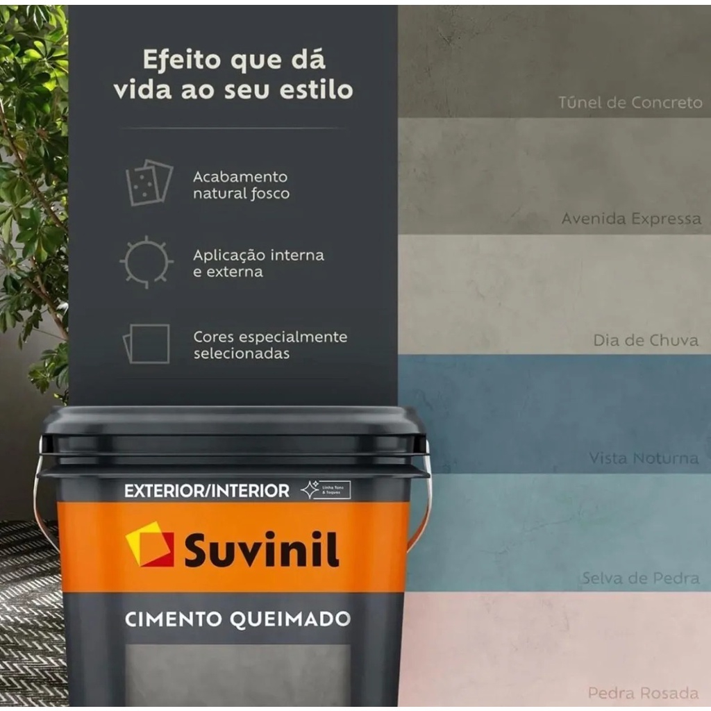 A Tinta Suvinil Cimento Queimado é uma tinta decorativa específica para imitar a aparência de cimento queimado. Ela é composta por resinas acrílicas e pigmentos minerais, proporcionando uma boa cobertura e uma ótima resistência às condições climáticas. É indicada para aplicação em paredes internas e externas, como em fachadas, hall de entrada, quartos, banheiros e cozinhas. A aplicação da Tinta Suvinil Cimento Queimado é fácil e pode ser feita com rolo ou pincel. Ela possui uma textura única, que imita o cimento queimado e pode ser aplicada em camadas para obter um efeito mais acentuado. Ela é disponível em diferentes tonalidades, permitindo a escolha da cor que mais se adapta ao ambiente. A Tinta Suvinil Cimento Queimado é resistente à água e ao tempo, garantindo uma boa durabilidade e fácil manutenção. Além disso, ela é atóxica e não emite odor durante a aplicação, o que a torna ideal para ambientes internos. É possível aplicá-la sobre outras tintas, desde que sejam limpas e secas, e ela pode ser limpa com água e sabão neutro. Este produto proporciona um visual rústico e despojado, que pode ser usado para dar um toque especial à decoração de sua casa. O efeito Cimento Queimado é um dos mais populares em decoração e vem ganhando cada vez mais espaço. Além disso, além de estético, é uma opção de baixo custo para renovação de ambientes. Acabamento: -Fosco Secagem: -Ao toque: 2 horas -Entre demãos: 8 horas -Final: 24 horas Rendimento acabado: -Até 9 m² Quantidade necessária de demãos: -2 a 3 Diluição: -Pronto para uso *Atenção! As cores nas imagens são apenas referências, podendo existir variações em relação a cor do produto em telas do computador/celular.