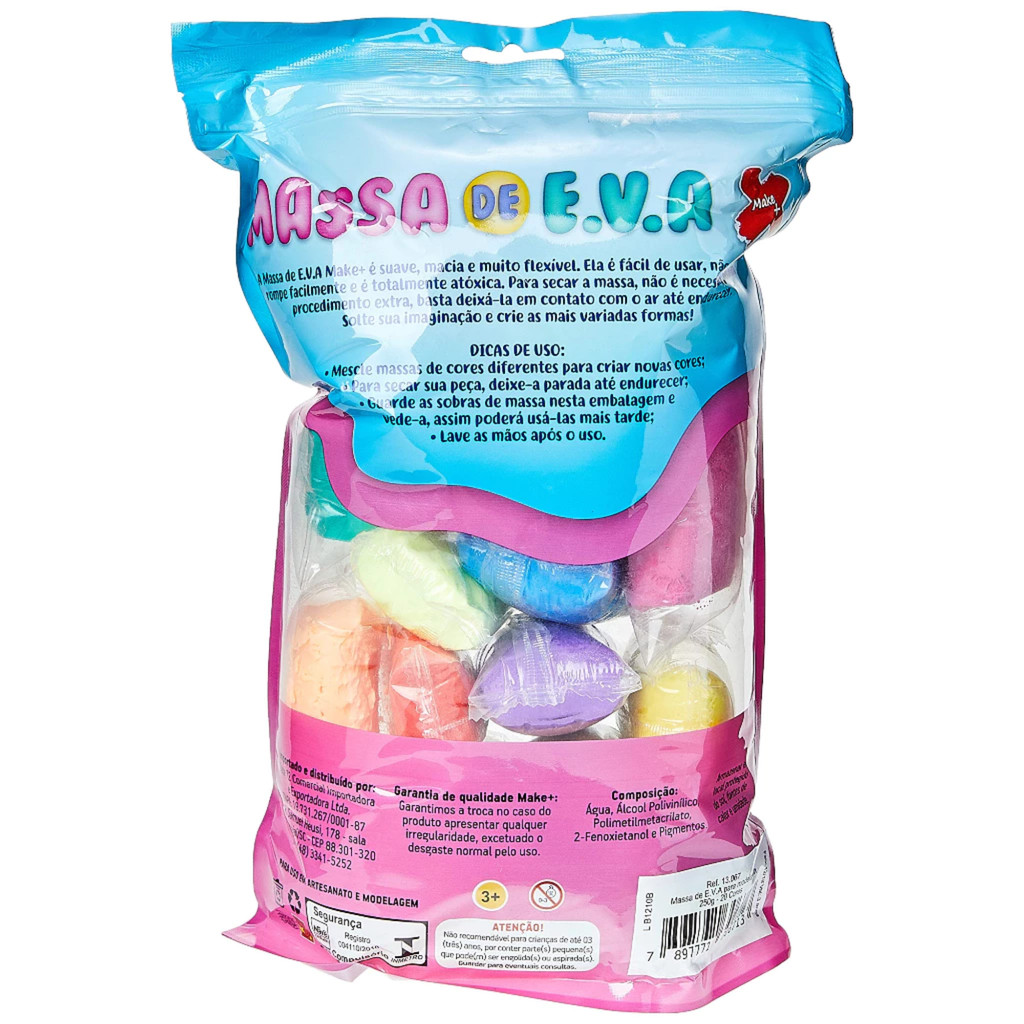 Massa de EVA leve e macia, ideal para modelagem e trabalhos de artesanato. Pacote com 250g contendo 20 cores sortidas para criar peças criativas, coloridas e com excelente acabamento. Fácil de manusear, não tóxica e com ótima fixação. Perfeita para uso escolar, hobbies e projetos artísticos. Marca: Make+; Referencia: 13067; Codigo: 477709; Caracteristicas do produto: Massa de EVA Para Modelar Lisa 20 Cores 250g Make+; Embalagem: 1 Pacote com 20 Cores