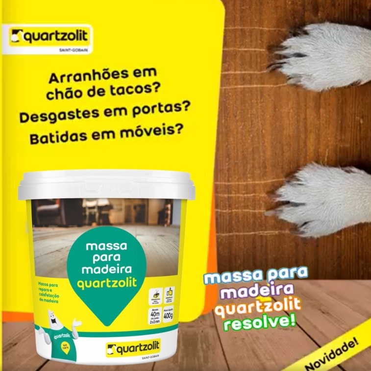 massa para madeira quartzolit A massa para madeira quartzolit é uma massa acrílica para preenchimento de juntas ou reparo de fendas em superfícies de madeira: como assoalhos, pisos de tacos, MDF rodapés, degraus, batentes de portas e janelas. Ela já vem pronta para uso em uma bisnaga de fácil aplicação, proporcionando um acabamento liso e de qualidade. Já vem pronta para uso em uma bisnaga de fácil aplicação. Fácil de lixar. Proporciona um acabamento liso a superfícies. Não tem cheiro. Aceita acabamento com tinta látex (acrílica), lacas, vernizes, poliuretanos, esmalte sintético, ceras, etc. Sela e veda superfícies. Embalagem: pote de 400g. Cores: branco, carvalho, cerejeira, mogno e imbuia. Características e Benefícios Pronta para uso Fácil aplicação Fácil de lixar Não tem cheiro Aceita acabamento com tinta látex (acrílico), lacas, vernizes, poliuretanos, esmalte sintético, ceras, etc. Preparo de substrato A superfície a ser preenchida deve estar limpa, livre de poeiras, óleos, graxas, sabão, mofo ou qualquer outro tipo de contaminante que possa prejudicara aderência do produto. Aplicação • Faça um pequeno corte no bico da bisnaga de massa para madeira quartzolit; • O produto pode ser aplicado diretamente sobre a superfície de madeira e espalhado com o auxílio de uma espátula ou desempenadeira, afim de preencher totalmente o vão de reparo; • Após a secagem deve-se realizar acabamento com lixa massa quartzolit número 180/220 para proporcionar um acabamento liso; • O tempo de secagem varia de acordo com a espessura da camada aplicada, ou seja, quanto mais fina a camada, mais rápida será sua secagem. Em condições normais, uma camada de ½ mm seca ao ponto de lixamento em aproximadamente 30 minutos; • Acabamento com pintura pode ser realizado diretamente sobre a massa lixada, sem a necessidade do uso de seladores ou fundos especiais. A pintura deve ser realizada somente após a secagem total da massa aplicada, que é de 24h; • Para rejuntamento de assoalhos (calafetação), deve-se aplicar a massa com espátula ou desempenadeira, e dependendo da largura das juntas, faz-se necessário a aplicação de mais de uma demão da massa para se obter um preenchimento completo e uniforme dos espaços. Considere 3h para a secagem entre demãos; • Obs: Para assoalhos de tábua, a massa para madeira quartzolit não deve ser utilizada como produto responsável pela sustentação das tábuas entre si, podendo haver trincas na massa caso haja movimentação do assoalho