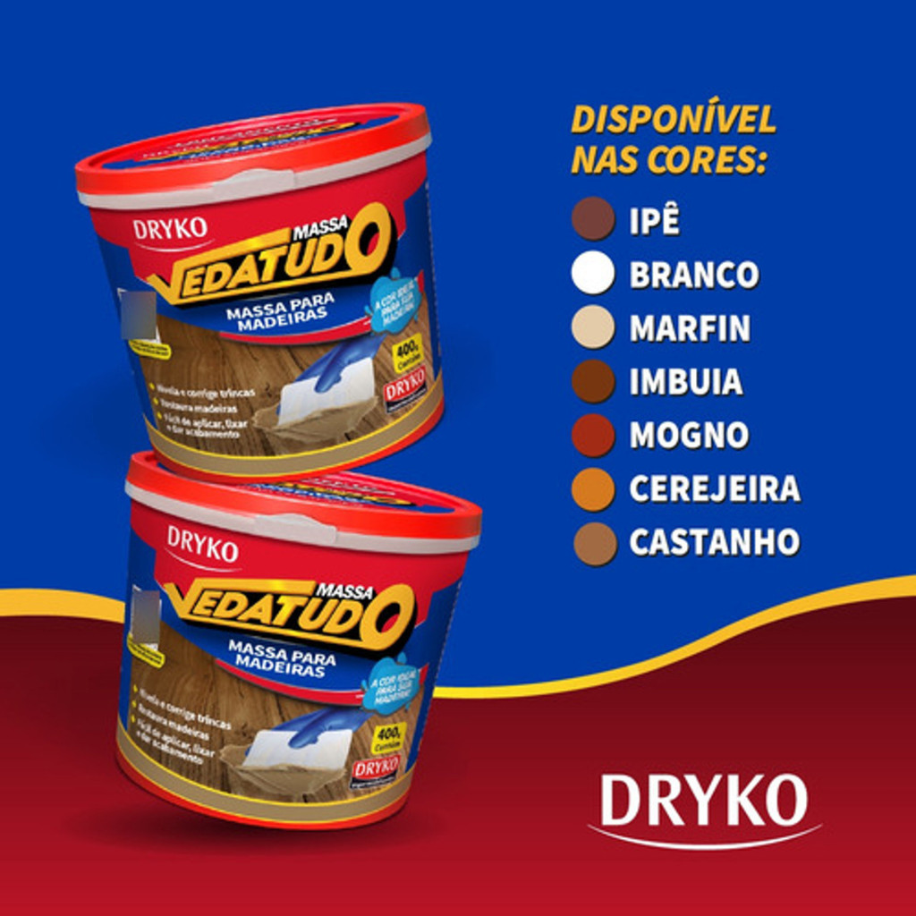 A DRYKO VEDATUDO MASSA PARA MADEIRAS é uma massa acrílica de base água para reparos e calafetações de superfícies de madeira em geral. ONDE APLICAR Nivelamento e correção de trincas; Madeira maciça e compensados; Assoalhos e piso laminado; Esquadrias de madeira; Móveis; MDF. EMBALAGEM Pote 400g - 200ml; VANTAGENS Cores variadas, podem ser misturadas entre si para criação de outras cores; Renova e restaura madeiras naturais e compensadas; Fácil de aplicar e lixar; Baixo odor e atóxico; Ótimo acabamento; Rápida secagem; Não retrai. CORES Branco; Marfim; Cerejeira; Mogno; Castanho; Imbuia; Ipê; Cedro; Eucalipto.