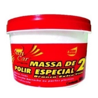 Massa de Polir N°2 À BASE DE AGUA (500GR) SUN CAR As massas polidoras são obtidas através da combinação de pós-abrasivos de granulometria cuidadosamente controlada, produto totalmente a base de água, evitando assim a vedação nas partes de borrachas e plásticas. É especialmente indicado para polimentos e eliminações de riscos ou imperfeições em pintura em geral. CARACTERÍSTICAS PRINCIPAIS Massa de polir branca extra fina a base de água. Não mancha borracha ou partes plásticasMaior poder de corteAbrasiva