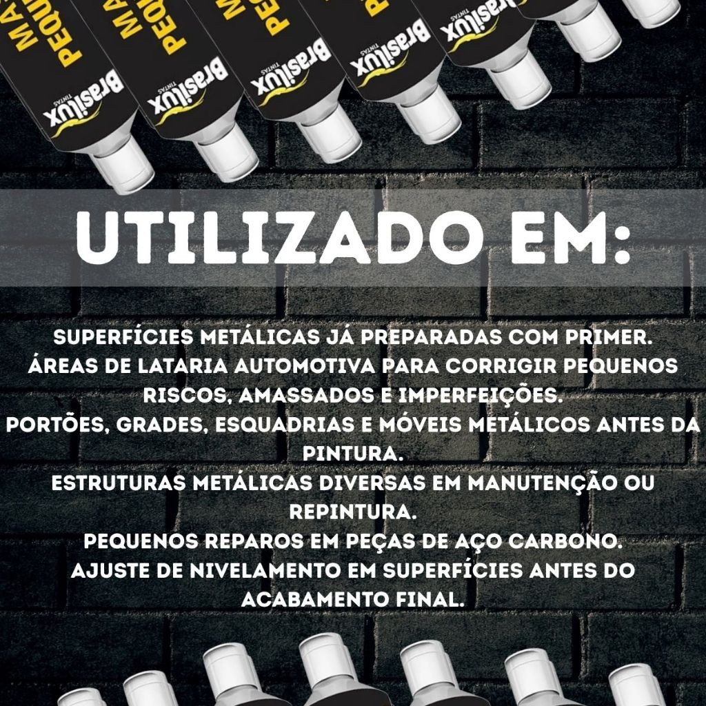 Massa para Pequenos Reparos Brasilux 150g Descrição: Indicada para corrigir pequenas imperfeições em superfícies metálicas, proporcionando acabamento uniforme e profissional. Sua fórmula combina resinas nitrocelulose e alquídica, pigmentos e cargas especiais selecionadas, garantindo: Alta aderência sobre superfícies metálicas. Ótima cobertura e poder de enchimento. Secagem rápida, agilizando o processo de pintura. Fácil lixamento, facilitando o acabamento final. Aplicação: Ideal para portões, grades, móveis e peças de metal. Basta aplicar com espátula de silicone ou similar, aguardar a secagem e lixar para nivelar. Ferramentas necessárias: Espátula de silicone ou equivalente. Embalagem: 150g – prática e econômica para reparos rápidos.