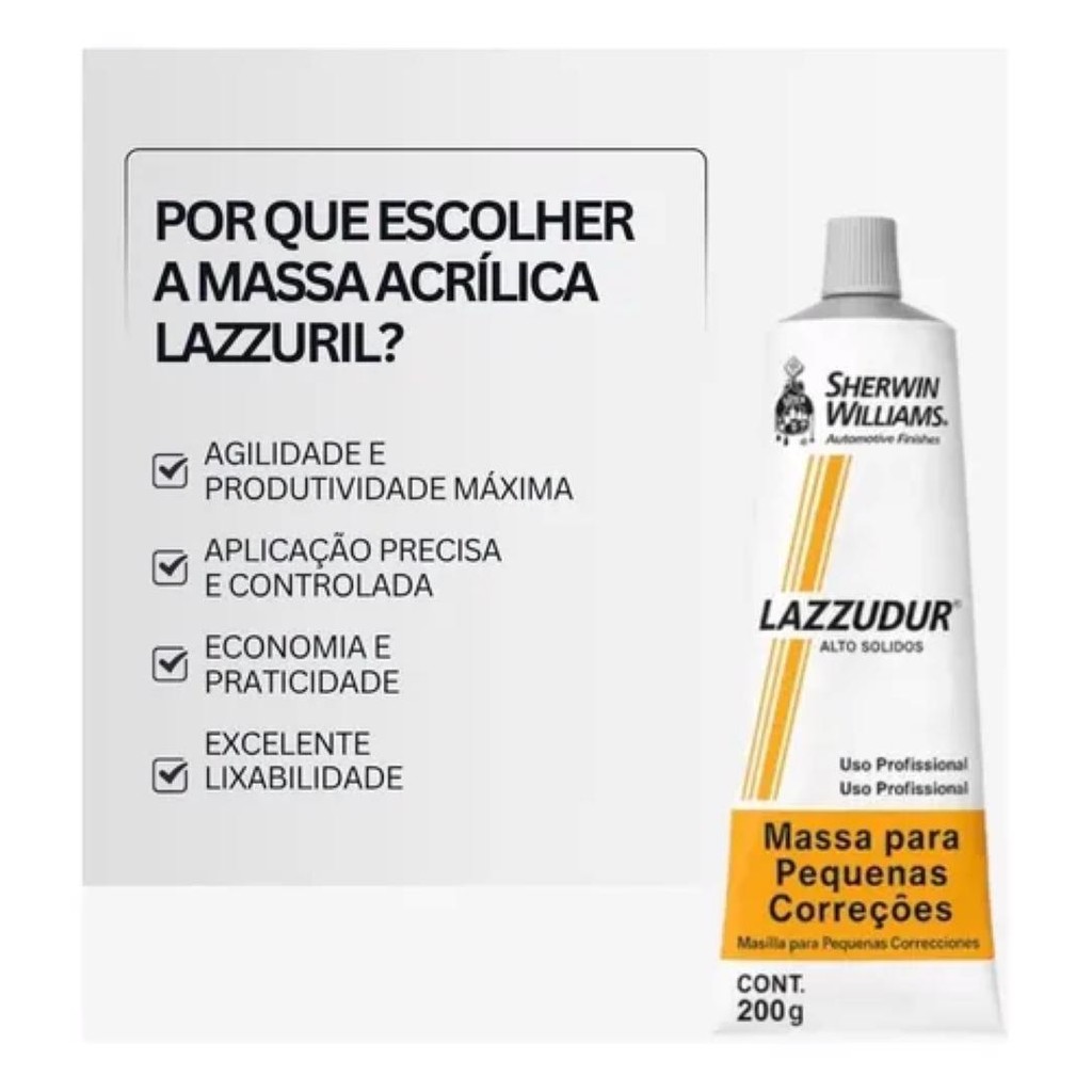 Para os detalhes que fazem toda a diferença, a Massa Acrílica para Pequenas Correções Lazzuril é a solução ágil e precisa. Ideal para o profissional que precisa de um reparo rápido ou para o entusiasta que busca um acabamento perfeito em seus projetos. POR QUE ESCOLHER A MASSA ACRÍLICA LAZZURIL? • AGILIDADE E PRODUTIVIDADE MÁXIMA Sua fórmula de secagem ultra rápida (20 a 30 minutos para lixamento) permite que o trabalho flua sem longas esperas. É a ferramenta perfeita para reparos rápidos que não podem parar sua linha de produção. • APLICAÇÃO PRECISA E CONTROLADA Desenvolvida para ser aplicada em camadas finas com espátula ou celulóide, ela oferece total controle para corrigir os menores defeitos, como poros, riscos finos e pequenas imperfeições em massas e primers. • ECONOMIA E PRATICIDADE A embalagem de 200g tem o tamanho ideal para reparos de detalhe, evitando o desperdício de material que ocorre ao abrir latas maiores para um trabalho pequeno. • EXCELENTE LIXABILIDADE Após a secagem, a massa apresenta uma lixabilidade macia e uniforme, facilitando o nivelamento e a criação de uma superfície perfeitamente lisa, pronta para receber o próximo passo do acabamento. ESPECIFICAÇÕES DO PRODUTO: • Marca: Lazzuril (Sherwin-Williams) • Produto: Massa Acrílica para Pequenas Correções • Conteúdo: 200g • Aplicação: Espátula ou celulóide, em camadas finas. • Secagem para Lixamento: 20 a 30 minutos (a 25°C). • Indicação: Correção de pequenos riscos, poros e imperfeições sobre massas e primers. A solução rápida e eficiente para os detalhes que definem um acabamento de alta qualidade. MASSA PEQUENOS REPAROS E CORREÇÕES AUTOMOTIVA 200G LAZZURIL