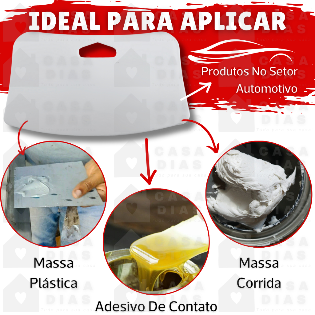 Casa Dias Comercio Eletrônico Olá a Casa Dias foi criada para facilitar o dia-a-dia de seus clientes. Prezamos pelo atendimento personalizado, produtos de qualidade, entrega rápida e preços competitivos. Fique tranquilo para comprar com quem está disposto a te oferecer o melhor atendimento, e caso tenha algum problema após a compra, conte com nossa equipe de pós venda para solucioná-lo. CASA DIAS, nossa missão é encantar você! Kit Massa Plástica + Espátula Aplicadora Massa Plástica 400g, a solução definitiva para reparos impecáveis! Sua aliada imbatível contra: Rachaduras em mármore, granito e cubas Imperfeições na funilaria de veículos Danos em superfícies metálicas, galvanizadas, máquinas e equipamentos Adesão imbatível: Aço, cobre, chumbo, ferro, antimônio, bronze, vidro, madeira, cimento e muito mais! Cores: Branco, Preto, Cinza Versatilidade sem igual: Torneada, furada, serrada e resistente ao calor. Perfeita para qualquer reparo! Aplicação prática: Prepare a superfície: lixe com grão 80 ou 150 e limpe com Solução Desengraxante. Misture o Adesivo com o Catalisador MEK (1g para cada 100g) em 3-5 minutos. Aplique em camadas finas até corrigir o defeito. Aguarde a secagem (60-120 minutos) e lixe com grão 80-320. Espátula Plástica Flexível para Aplicações Profissionais Descubra a ferramenta que vai revolucionar seus trabalhos de acabamento e reparo! Nossa Espátula Plástica é a escolha perfeita para profissionais exigentes que buscam precisão e versatilidade. Características Principais: Material de Alta Qualidade: Fabricada com polietileno de baixa densidade, oferece a flexibilidade ideal para trabalhar com diferentes materiais. Design Inovador: É flexível, permite que a espátula se adapte perfeitamente a superfícies curvas, garantindo um acabamento suave e uniforme. Multiuso: Ideal para aplicação de massa poliéster (automotiva), massa plástica, massa corrida, rejunte e muito mais. Ergonomia: Projetada para ser confortável e fácil de manusear, reduzindo a fadiga durante o uso prolongado. Especificações Técnicas: Cor: Branca Medidas: 13cm x 6,5cm Resistente a produtos químicos e fácil de limpar após o uso. Ideal para: Setor automotivo: aplicação de cola plástica e adesivos de contato. Construção civil: aplicação de massa corrida e rejunte. Trabalhos artesanais: aplicação de massas e colas especiais.