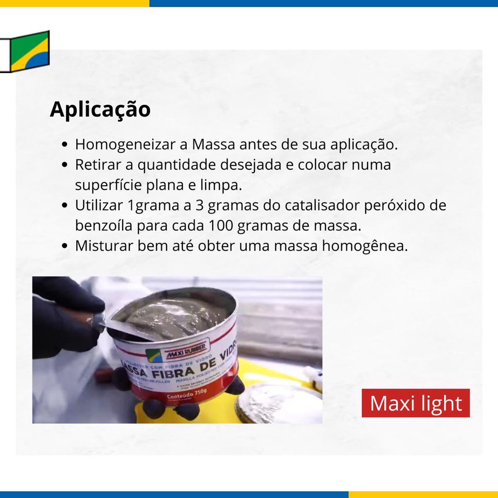 Massa Poliéster Com Fibra De Vidro 750g - Maxi Rubber.......................................................................INFORMAÇÕES SOBRE O PRODUTO.....................................................................................................................................Apropriado para reparar peças de fibra de vidro. Pode ser utilizado em superfícies metálicas ferrosas (Galvanizadas, Zincadas e Alumínio).VantagensProporciona maior reforço estrutural, excelente aderência em diferentes substratos e fácil lixamento......................................................................................................................................ESPECIFICAÇÕES DO PRODUTO.....................................................................................................................................Preparo da SuperfícieLixar com lixa 80 ou 150. Em seguida limpar a peça com Solução Desengraxante Maxi Rubber removendo toda oleosidade, poeira, corrosão e água. AplicaçãoHomogeneizar a Massa antes de sua aplicação.Retirar a quantidade desejada e colocar numa superfície plana e limpa.Utilizar 1grama a 3 gramas do catalisador peróxido de benzoíla para cada 100 gramas de massa. Misturar bem até obter uma massa homogênea. OBS.: O tempo gasto desde a mistura da massa com o catalisador até a sua aplicação pode variar de 3 a 5 minutos.Aplicar a massa catalisada, com o auxílio de um aplicador (celuloide), em camadas finas exercendo pressão moderada para garantir melhor adesão. Aplique camadas adicionais até que o defeito seja corrigido. Após a secagem efetuar o lixamento com lixa a seco (lixas 80 - 150 e final com lixa 220 - 320).Secagem para lixamento(25°C): de 20 a 30 minutos.O produto deve ser aplicado direto sobre chapa nua.Na preparação da massa (catálise) utilizar a quantidade correta de catalisador (1% a 3%), evitando assim problemas como, por exemplo, sangramento.Não recoloque na lata a mistura já preparada.Aguardar o tempo de secagem recomendado, para evitar mapeamento.Evitar a secagem forçada em temperaturas elevadas, pois pode causar trincas, bolhas e perda de adesão.Não é recomendado o lixamento úmido do adesivo, pois a umidade retida no adesivo durante o lixamento com água pode causar problemas na superfície e no acabamento.solar o local do reparo com Primer PU Maxi Rubber antes da aplicação do acabamento.EmbalagemEmbalagem de 750g acompanha catalisador de 24gValidade12 meses. Estocado a temperatura de 15 a 35ºC e livre de umidade.Rendimento0,59 m²/kgComposiçãoMassa Poliéster: Resina de poliéster, cargas, fibra de vidro e aditivos.Catalisador: Peróxido de benzoila e plastificantes.....................................................................................................................................DÚVIDAS FREQUENTES.....................................................................................................................................Pergunta: Como é embalado o produto?Resposta: Todos os nossos produtos vendidos são embalados em caixas lacradas ou plástico stretch. Em respeito ao meio ambiente 90% das caixas são reutilizadas.Pergunta: Quem faz a entrega?Resposta: A entrega é terceirizada, feita via CORREIOS ou TRANSPORTADORA.Pergunta: O envio é feito em quantos dias?Resposta: Nós enviamos o seu pedido no prazo máximo de 24 horas após a confirmação de sua compra, sendo um dos envios mais rápidos da plataforma.Pergunta: Os produtos são novos ou usados?Resposta: Todos os produtos que trabalhamos são novos e com qualidade garantida......................................................................................................................................