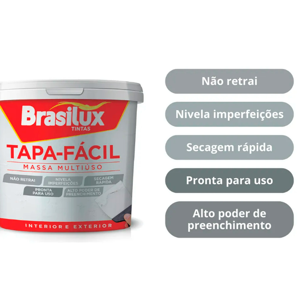 Massa Multiuso Tapa-Fácil 150g – Brasilux MS 460065140 A Massa Multiuso Tapa-Fácil Brasilux 150g é um produto prático e eficiente, desenvolvido para corrigir imperfeições, trincas, furos e pequenos reparos em superfícies variadas. Sua fórmula de secagem rápida e alta aderência garante um acabamento uniforme, fácil de lixar e pronto para pintura, proporcionando resultados profissionais mesmo em aplicações domésticas. De fácil manuseio, a Tapa-Fácil é ideal para reparos rápidos e seguros em alvenaria, madeira, gesso, concreto e outras superfícies, dispensando o uso de equipamentos complexos. Características principais Massa pronta para uso, prática e versátil. Corrige furos, rachaduras, trincas e imperfeições. Alta aderência em diferentes tipos de superfície. Fácil aplicação e secagem rápida. Acabamento liso e uniforme. Pode ser lixada e pintada após a cura. Embalagem prática de 150g. Aplicações Reparos em paredes de alvenaria e concreto. Correção de imperfeições em superfícies de gesso. Acabamentos em madeira antes da pintura. Uso doméstico, profissional e em manutenção predial. Especificações Técnicas Marca: Brasilux Modelo: MS 460065140 Produto: Massa Multiuso Tapa-Fácil Peso líquido: 150g Cor: Branca (padrão, aceita pintura após secagem) Tipo: Pronta para uso Unidade: 1 peça (UN) Massa Multiuso Tapa-Fácil Brasilux 150g MS 460065140 Massa Tapa-Fácil Brasilux 150g para Reparos em Paredes e Madeira Massa de Reparos Multiuso 150g Brasilux Tapa-Fácil Tapa-Fácil 150g Brasilux – Massa Pronta para Pequenos Reparos massa tapa fácil brasilux 150g massa multiuso brasilux ms 460065140 massa pronta para reparo parede