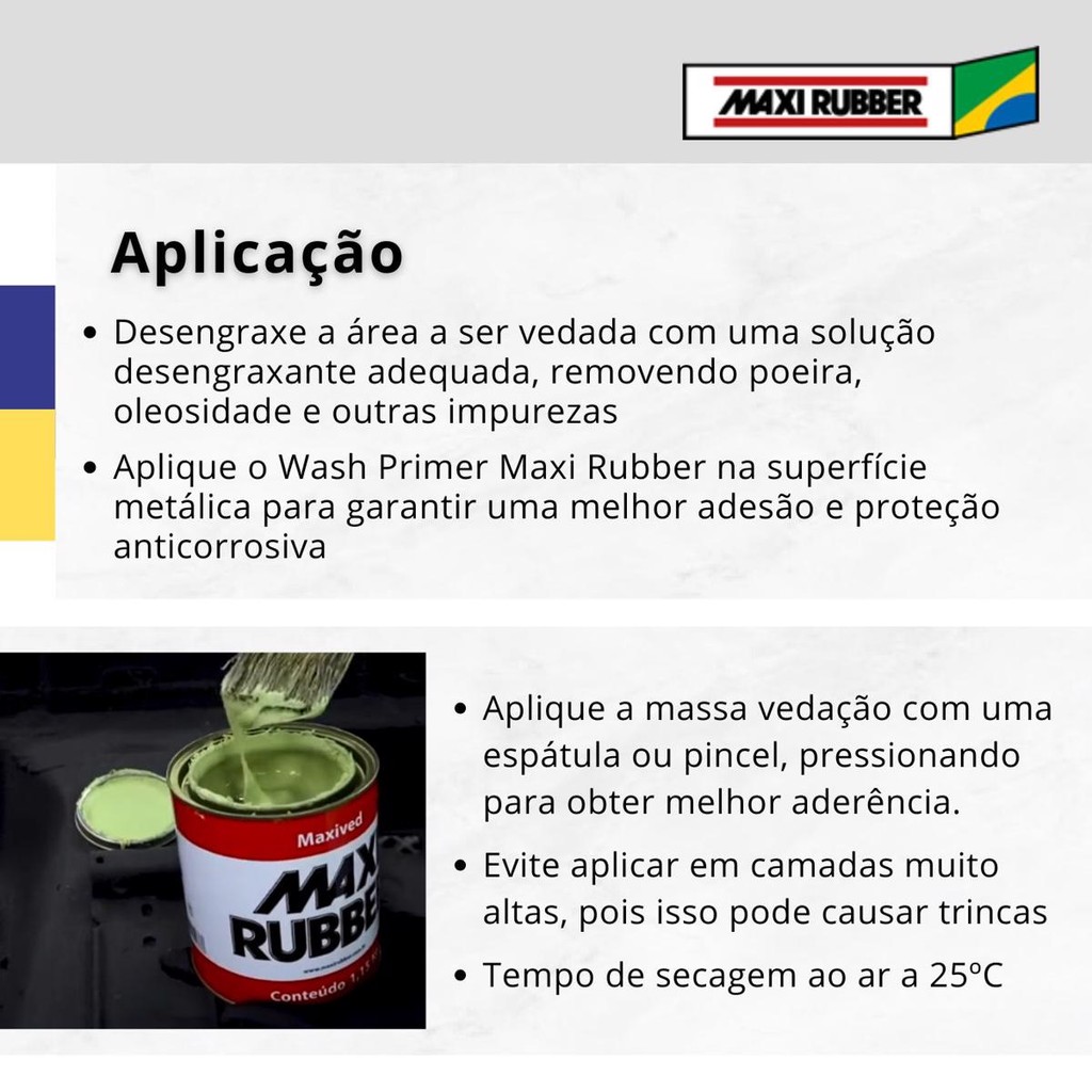 Massa Vedação Automotiva Maxived Maxi Rubber 1,15kg ....................................................................... INFORMAÇÕES SOBRE O PRODUTO ..................................................................................................................................... Indicado para vedação e fixação permanente de chapas metálicas em carrocerias de automóveis e caminhões, emborrachamento original, reforço interno de capôs, calhas, para-lamas, soleiras e compartimentos de faróis, evitando a infiltração de água e poeira. Também é utilizado em dobras, rebites, soldas, e cantos de chapas metálicas na reparação de veículos, junções de calhas, embarcações, construção civil e uso geral. ..................................................................................................................................... ESPECIFICAÇÕES DO PRODUTO ..................................................................................................................................... • Lixar a área a ser reparada removendo ferrugem. • Desengraxar o local com Solução Desengraxante Maxi Rubber, eliminando os vestígios de poeira, oleosidade e outras impurezas que possam comprometer o desempenho do produto. •Preparar a superfície e aplicar o Wash Primer Maxi Rubber para uma perfeita adesão em metais não ferrosos e uma melhor proteção anticorrosiva em metais ferrosos. APLICAÇÃO • Produto pronto para uso. • Aplicar com espátula ou pincel, pressionando para obter melhor aderência. SECAGEM Tempo de secagem ao ar a 25ºC • Não aplicar o Maxived em camadas muito alta, pois o mesmo poderá apresentar trincas. • Quando aplicado tinta sobre o produto, pode sofrer alteração de cor. Embalagem Embalagem de 1,15 Kg Validade 12 meses. Estocado a temperatura de 15 a 35ºC e livre de umidade. Rendimento 13 m²/galão (camada de 1 mm) Composição Maxived: Poliol de ácidos graxos, aditivos, solventes orgânicos e cargas minerais. ..................................................................................................................................... DÚVIDAS FREQUENTES ..................................................................................................................................... Pergunta: Como é embalado o produto? Resposta: Todos os nossos produtos vendidos são embalados em caixas lacradas ou plástico stretch. Em respeito ao meio ambiente 90% das caixas são reutilizadas. Pergunta: Quem faz a entrega? Resposta: A entrega é terceirizada, feita via CORREIOS ou TRANSPORTADORA. Pergunta: O envio é feito em quantos dias? Resposta: Nós enviamos o seu pedido no prazo máximo de 24 horas após a confirmação de sua compra, sendo um dos envios mais rápidos da plataforma. Pergunta: Os produtos são novos ou usados? Resposta: Todos os produtos que trabalhamos são novos e com qualidade garantida. .....................................................................................................................................