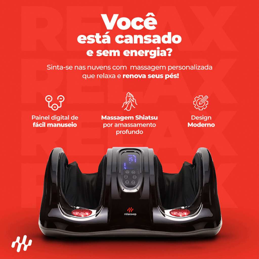 Sejam Bem-Vindos a RELAXSHOP® uma marca reconhecida pelo Instituto Nacional de Marca registrada no BRASIL. Atuamos no segmento de aparelhos portáteis de massagem, há mais de 10 anos e somos uma loja que faz parte do Programa de Vendedores Indicados da Shopee. O que significa LOJA INDICADA? *** Compra 100% segura pela Shopee e Relaxshop®; *** Produto 100% Original; *** Suporte ao Cliente Online exclusivo. Trabalhamos somente com produtos: *** A PRONTA ENTREGA; *** COM NOTA FISCAL; *** PRODUTOS ORIGINAIS. NOSSOS DIFERENCIAIS: *** Pedidos separados e embalados no máximo em 24h úteis; *** Suporte Online exclusivo; *** Produtos de Alta Qualidade; *** Assistência Técnica Própria. Descrição do Produto: Sinta-se nas nuvens com massagem personalizada que relaxa e renova seus pés! Você está cansado e sem energia? Que tal relaxar seus pés e tornozelo antes de dormir? O Massageador para os pés Foot Massager, simula as técnicas de massagens nos seus pés e tornozelos no conforto do seu sofá, poltrona ou direto na sua cama, oferecendo uma massagem incrível sem precisar sair de casa. O Massageador para os pés Foot Massager, é um massageador moderno e de alta qualidade que estimula os pontos vitais dos seus pés. Com massagem pré-programadas e a intensidade, você comanda a massagem na palma da sua mão. Foot Massager ideal para qualquer momento!!! O Foot Massagem é Bivolt, você pode usá-lo em qualquer voltagem sem se preocupar! O conceito de massagem nos pés provém da tradição milenar chinesa, e reflete positivamente em todas as regiões do nosso corpo, promovendo o aumento do metabolismo e melhorando a microcirculação. INDICAÇÕES: - Relaxamento o local aplicado; - Melhora da circulação sanguínea; - Alívio da fadiga; - Dores nos pés e panturrilhas. TIPOS DE MASSAGEM: - Massagem nos pés; - Massagem no Tornozelo; - Massagem na Panturrilhas; Dados Técnicos: Peso5,500Kg Dimensão: 26X57X35cm Forma de usar: Ligado na tomada Aplicação: Pés Marca: Relaxshop Garantia: 1 ano Cor: Preto Frequência: 50-60 Hz Potência: 40 W Velocidade: 3 velocidades Voltagem: Bivolt Tamanho do cabo: 1,45 M Rotação: 2.300 RPM FOTOS DO PRODUTOS ATUALIZADO DIA 14 DE MARÇO DE 2025.