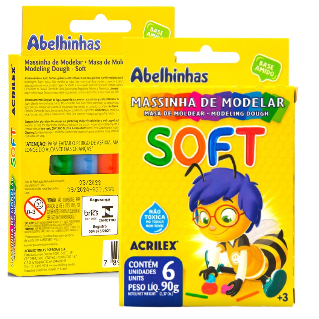 MASSA DE MODELAR COM 6 CORES ABELHINHAS SOFT - ACRILEX Pedidos feitos até às 12:00 horas (de segunda à sexta) são despachados no mesmo dia! DESCRIÇÃO: - Quantidades: 1 caixa com 6 cores. - Ideal para crianças maiores de 3 anos. - Super macia. - Não mancha as mãos. - Não comestível. - Não Tóxica. - Marca: Acrilex - A base de amido. CORES INCLUSAS: - BRANCO. - AMARELO. - VERMELHO. - AZUL. - VERDE. - MARROM. RECOMENDAÇÕES DE ARMAZENAMENTO: Após brincar, guarde as massinhas em um saco plástico e preferencialmente dentro de um pote bem tampado.