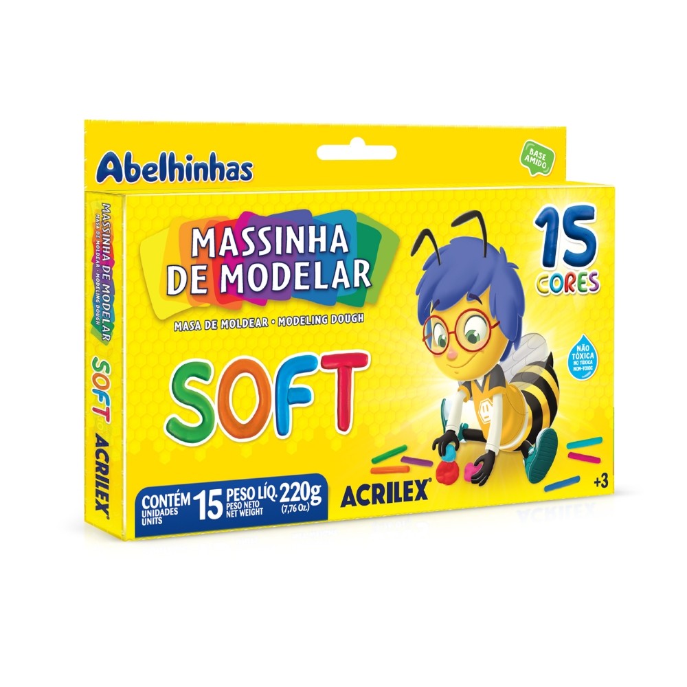 Massinha De Modelar Acrilex Soft 15 Cores, 220g, 073140000 A Massinha de Modelar Soft da Acrilex é um clássico para a diversão e desenvolvimento infantil. Este kit com 15 cores vibrantes e um total de 220g é perfeito para soltar a imaginação em trabalhos escolares, atividades de lazer e para aprimorar a coordenação motora fina. Sua textura super macia e segura garante horas de criatividade sem preocupação. Diferenciais: Textura Super Macia: Desenvolvida para ser extremamente macia e maleável, facilitando a modelagem e sendo muito agradável ao toque, ideal para as mãos das crianças. Grande Variedade de Cores: Com 15 cores distintas no kit, permite a criação de trabalhos ricos em detalhes e com uma paleta de cores ampla, incentivando a criatividade. Cores Miscíveis: Todas as cores podem ser misturadas entre si para formar novas tonalidades, transformando a brincadeira em uma aula prática e divertida sobre a teoria das cores. Não Gruda nas Mãos: Sua fórmula foi pensada para minimizar a sujeira, evitando que a massa grude excessivamente nas mãos ou na maioria das superfícies. Produto Seguro e Atóxico: É totalmente atóxica e segura para o manuseio infantil, proporcionando tranquilidade para pais e professores durante o uso. Dicas de Uso: Conservação: Para manter a massinha macia por mais tempo, guarde-a em um pote ou saco plástico bem vedado após o uso e longe do calor. Criação de Mosaicos: Peça para a criança fazer pequenas bolinhas de massinha de várias cores e preencher um desenho colando-as sobre o papel, criando um efeito de mosaico. Ferramentas de Modelagem: Utilize objetos do dia a dia, como palitos de sorvete, tampinhas de caneta ou garfos de plástico, para criar diferentes texturas e detalhes nas criações. Limpeza: Para remover de tecidos ou tapetes, espere a massinha secar completamente. Depois de endurecida, use uma escova para retirar os pedaços maiores. Ficha Técnica: Produto: Massinha de Modelar Soft Fabricante: Acrilex Conteúdo: Caixa com 15 tabletes de massa de modelar Peso Líquido Total: 220g Composição: Água, Carboidrato de Cereais, Cloreto de Sódio, Conservante, Fragrância, Aditivos e Pigmentos. Toxicidade: Não Tóxica Indicação de Idade: A partir de 3 anos Diferencial: Textura macia e grande variedade de cores.