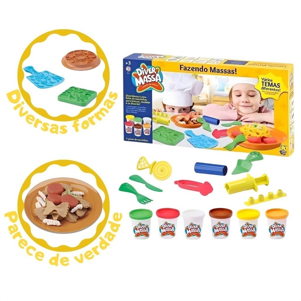 Voce pode criar diversos tipos de massas de mentirinha com a Fazendo Massas da Diver Massa. A Fazendo Massas reproduz diversos tipos de massa! Seus pequenos se sentirao na propria Italia enquanto fazem suas criacoes com a Diver Massa e ainda poderao incrementar o prato produzindo outros alimentos com as forminhas! Escolha um dos bicos da seringa coloque massinha e aperte a alca comecar a producao de massas. Use o molde e o cortador para criar ravioli e lasanha. Quando estiver tudo pronto, coloque no pratinho. E lembre-se o melhor ingrediente e a imaginacao! Este produto ajuda na coordenacao motora fina, criatividade e imaginacao sao os grandes estimulos dessa colecao. Contem: 6 potes de massinha 50g cada, totalizando 300g de massa: amarelo, verde, branco, vermelho, marrom e bege, 1 kit faca e garfo, 1 espatula, 1 cortador de pizza, 1 rolinho, 1 seringa com 4 bicos de formas variadas, 1 pegador, 1 formas de massa, 1 forma de carne e 1 forma de legumes. ESPECIFICACOES: Idade Recomendada: A partir de 3 anos Material/Composicao: Plastico. Massinha: Cloreto de sodio, cloreto de calcio, benzonato de sodio, dihidrogenofosfato de potassio, oleo mineral branco, essencia, pigmento, farinha de trigo e agua. Contem gluten. Conteudo da Embalagem: 6 potinhos de massinha de 50g cada, totalizando 300g massa: amarelo, verde, branco, vermelho, marrom e bege, 1 kit faca e garfo, 1 espatula, 1 cortador de pizza, 1 rolinho, 1 seringa com 4 bicos de formas variadas, 1 pegador, 1 formas de massa, 1 forma de carne e 1 forma de legumes. Medida Aproximada da Embalagem (A, L, C): 20x07x39cm Selo de Seguranca do Inmetro: CE-BRI/INNAC - 00909-01A NM 300/2002 OCP 0061 Certificacao: Certificado pelos Orgaos Autorizados - OCPS (Organismos de Certificacao de Produtos) Fabricante/Fornecedor: Divertoys