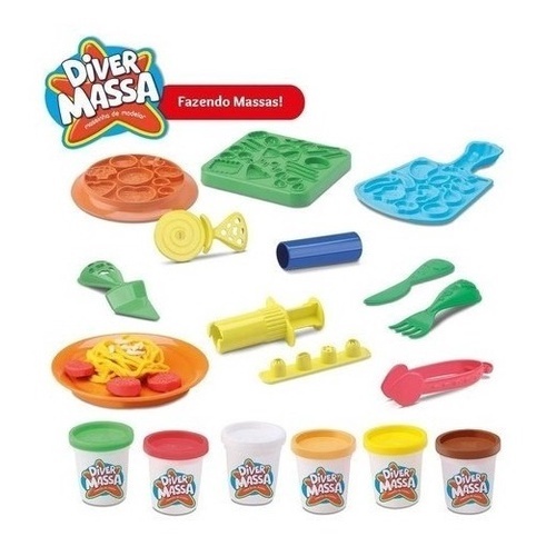 Voce pode criar diversos tipos de massas de mentirinha com a Fazendo Massas da Diver Massa. A Fazendo Massas reproduz diversos tipos de massa! Seus pequenos se sentirao na propria Italia enquanto fazem suas criacoes com a Diver Massa e ainda poderao incrementar o prato produzindo outros alimentos com as forminhas! Escolha um dos bicos da seringa coloque massinha e aperte a alca comecar a producao de massas. Use o molde e o cortador para criar ravioli e lasanha. Quando estiver tudo pronto, coloque no pratinho. E lembre-se o melhor ingrediente e a imaginacao! Este produto ajuda na coordenacao motora fina, criatividade e imaginacao sao os grandes estimulos dessa colecao. Contem: 6 potes de massinha 50g cada, totalizando 300g de massa: amarelo, verde, branco, vermelho, marrom e bege, 1 kit faca e garfo, 1 espatula, 1 cortador de pizza, 1 rolinho, 1 seringa com 4 bicos de formas variadas, 1 pegador, 1 formas de massa, 1 forma de carne e 1 forma de legumes. ESPECIFICACOES: Idade Recomendada: A partir de 3 anos Material/Composicao: Plastico. Massinha: Cloreto de sodio, cloreto de calcio, benzonato de sodio, dihidrogenofosfato de potassio, oleo mineral branco, essencia, pigmento, farinha de trigo e agua. Contem gluten. Conteudo da Embalagem: 6 potinhos de massinha de 50g cada, totalizando 300g massa: amarelo, verde, branco, vermelho, marrom e bege, 1 kit faca e garfo, 1 espatula, 1 cortador de pizza, 1 rolinho, 1 seringa com 4 bicos de formas variadas, 1 pegador, 1 formas de massa, 1 forma de carne e 1 forma de legumes. Medida Aproximada da Embalagem (A, L, C): 20x07x39cm Selo de Seguranca do Inmetro: CE-BRI/INNAC - 00909-01A NM 300/2002 OCP 0061 Certificacao: Certificado pelos Orgaos Autorizados - OCPS (Organismos de Certificacao de Produtos) Fabricante/Fornecedor: Divertoys