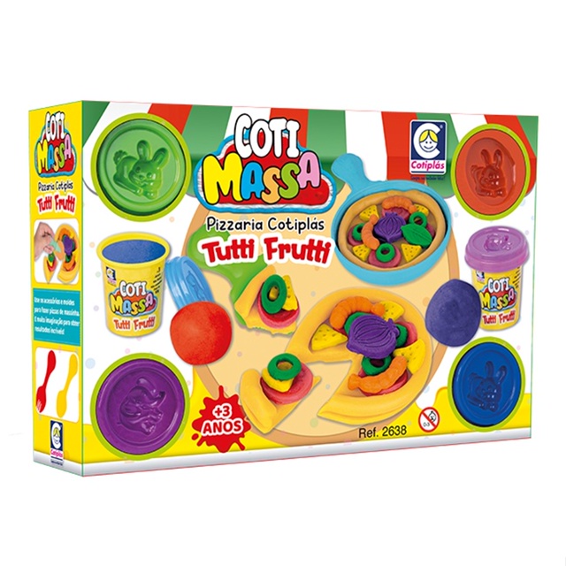 DESCRICAO: Brinquedo Massinha de Modelar Coti-Massa - Pizzaria Coti Massa e a nova linha da Cotiplas para brincar, modela e se divertir! Ideal para a familia soltar a imaginacao e se divertir muito com suas criacoes. O kit Pizzaria vem com 4 potinhos de massinha de 50g cada, cortador e espatula de pizza, tabua de moldes, prato, seringa para modelar, garfo e colher. Tudo que e necessario para se divertir pra valer com a criancada. Os produtos Coti Massa auxiliam na coordenacao motora fina, estimulam a criatividade e imaginacao, e garantem a diversao dos pequenos! ESPECIFICACOES: - Recomendado a partir de 3 anos - Dimensoes da Embalagem: : 29 x 7 x 19,5 cm - Material Atoxico - Linha: Coti Massa - Marca: Cotiplas - Referencia: 2638 - Certificado de Seguranca: INMETRO